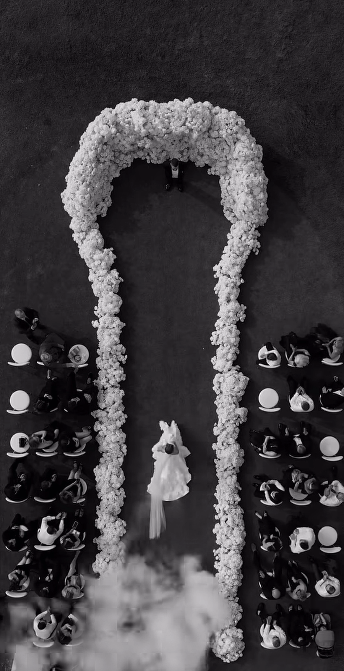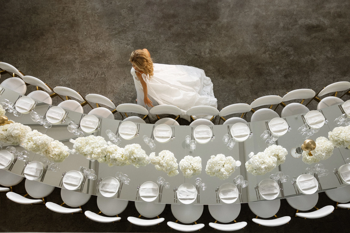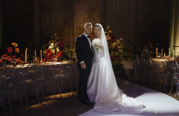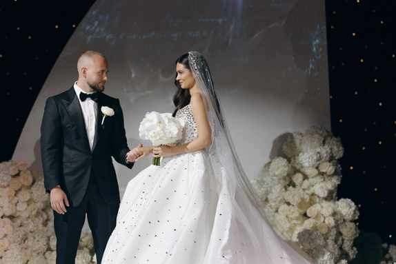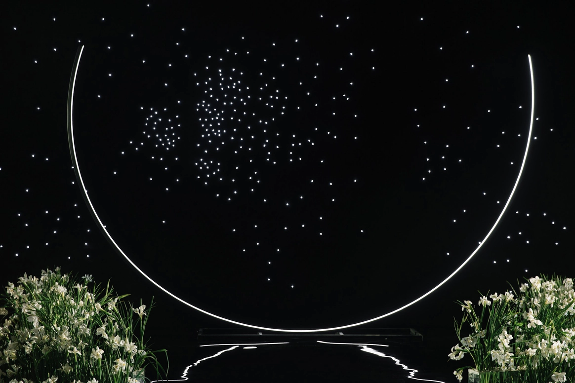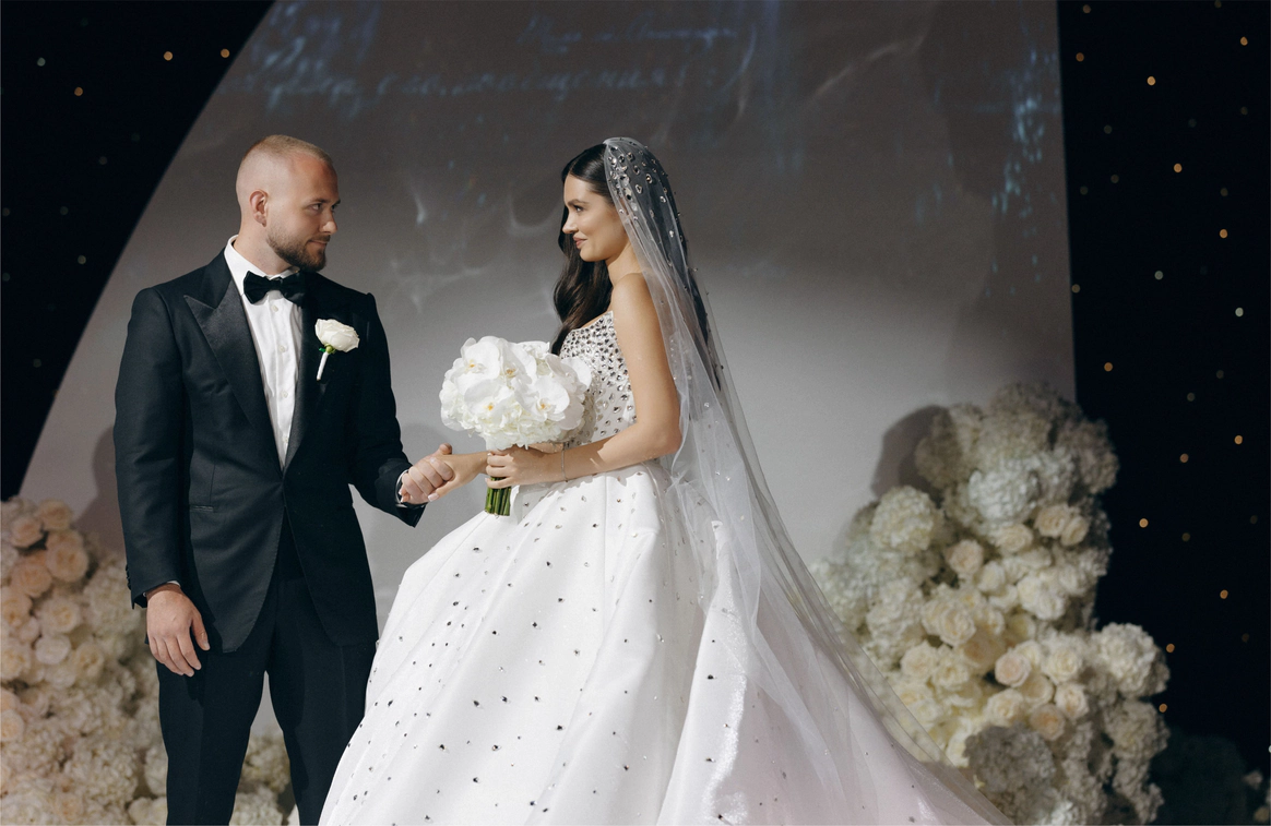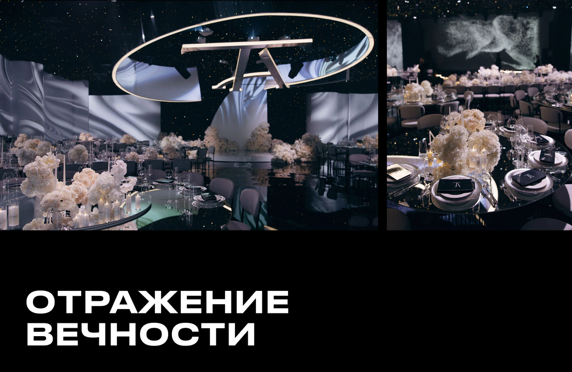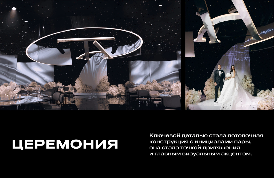 Ключевой деталью стала потолочная конструкция с инициалами пары, она стала точкой притяжения и главным визуальным акцентом. Световые сценарии и мультимедиа трансформировали пространство в течение вечера, меняя восприятие архитектуры декора.