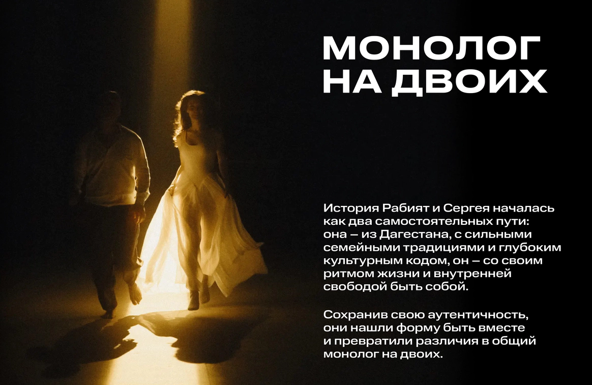 История Рабият и Сергея началась как два самостоятельных пути: она – из Дагестана, с сильными семейными традициями и глубоким культурным кодом, он – со своим ритмом жизни и внутренней свободой быть собой. Сохранив свою аутентичность, они нашли форму быть вместе и превратили различия в общий монолог на двоих.