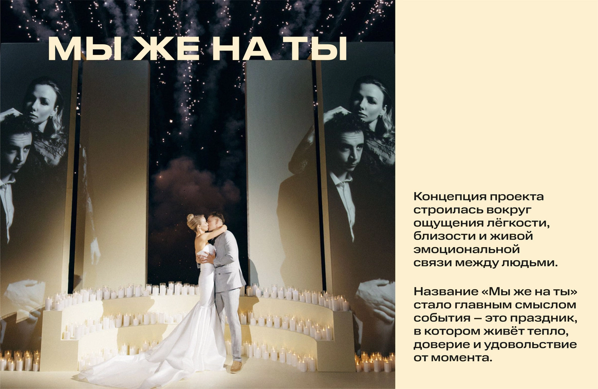 Концепция проекта строилась вокруг ощущения лёгкости, близости и живой эмоциональной связи между людьми. Название «Мы же на ты» стало не просто названием свадьбы, а главным смыслом события – это праздник, в котором живёт тепло, доверие и удовольствие от момента.