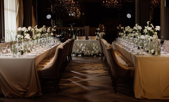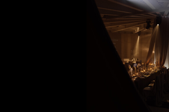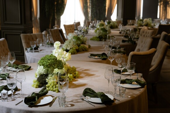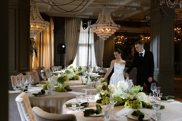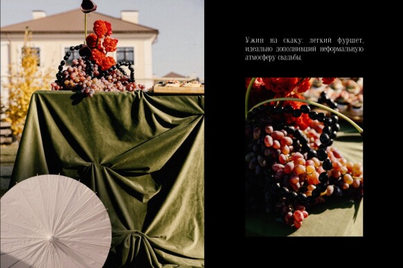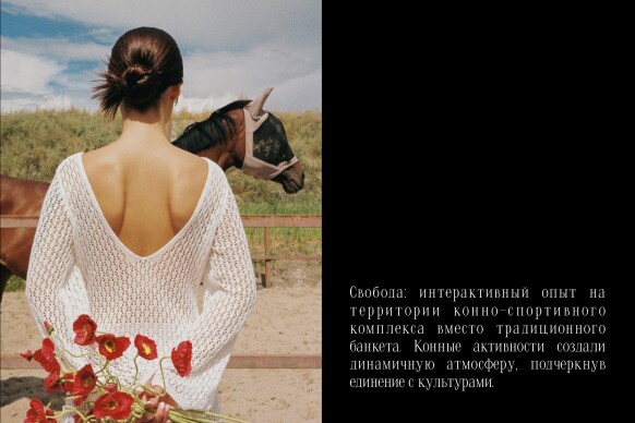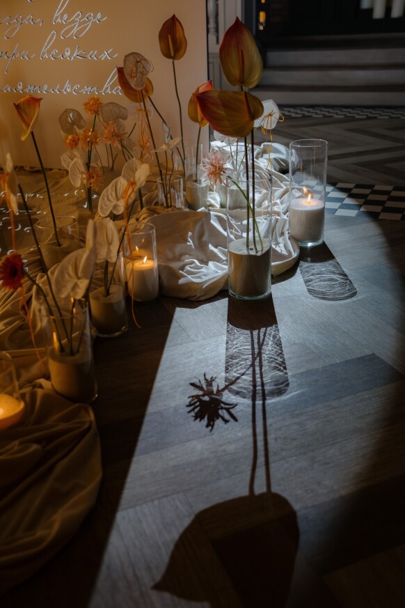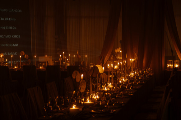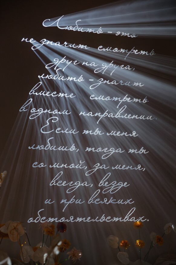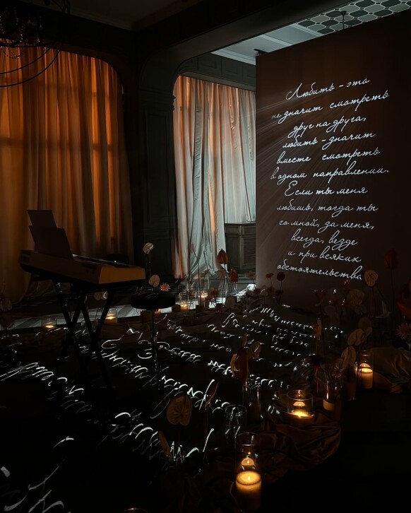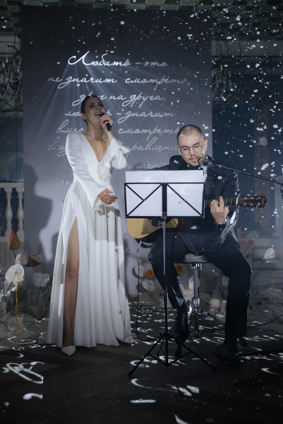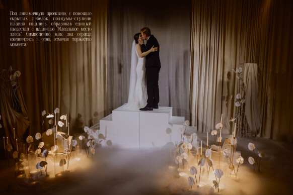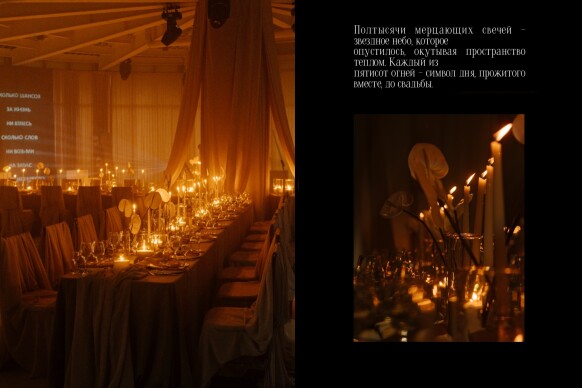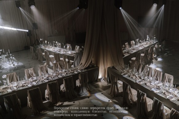 Кульминацией вечера стал захватывающий перформанс. Гости, поднявшиеся с мест на пересечении линий столов, по условному сигналу начали исполнять куплет любимой песни пары. А затем, в едином порыве, под аккомпанемент вспыхивающих световых приборов, припев превратился в настоящий взрыв звука и света.