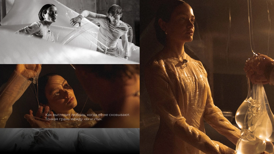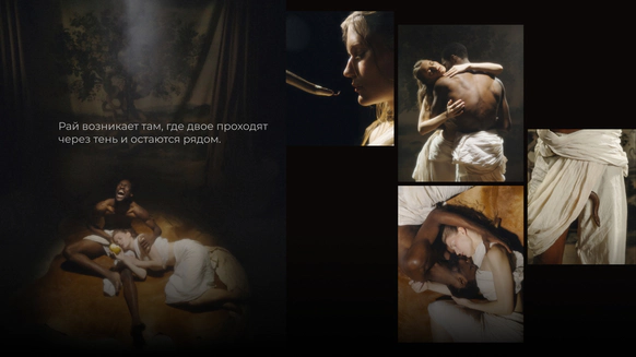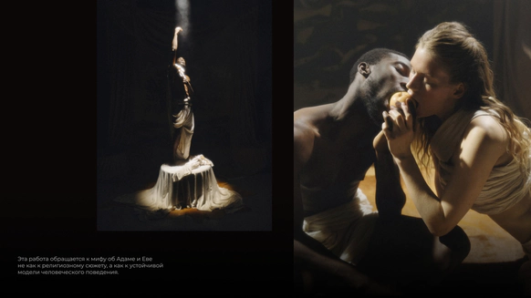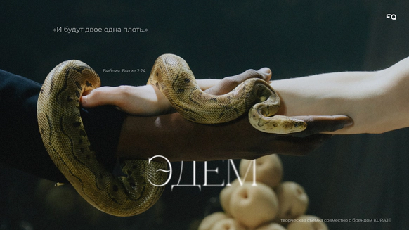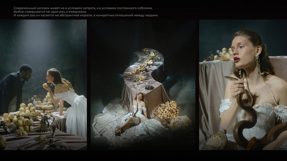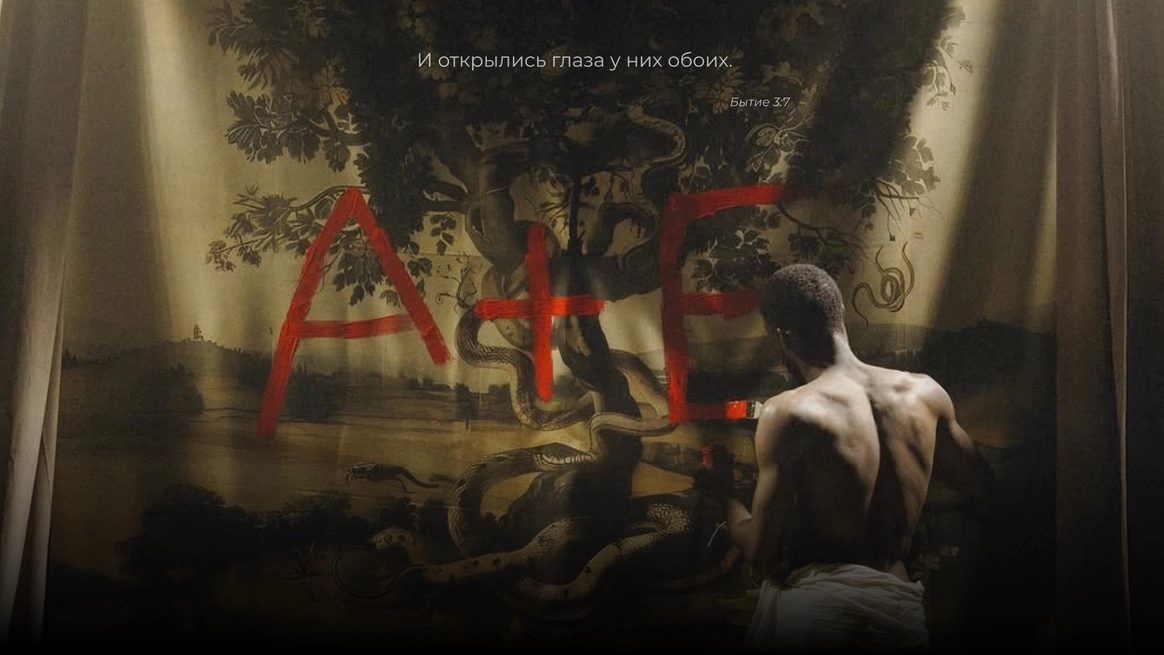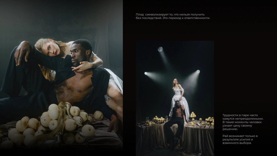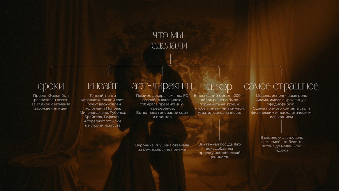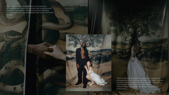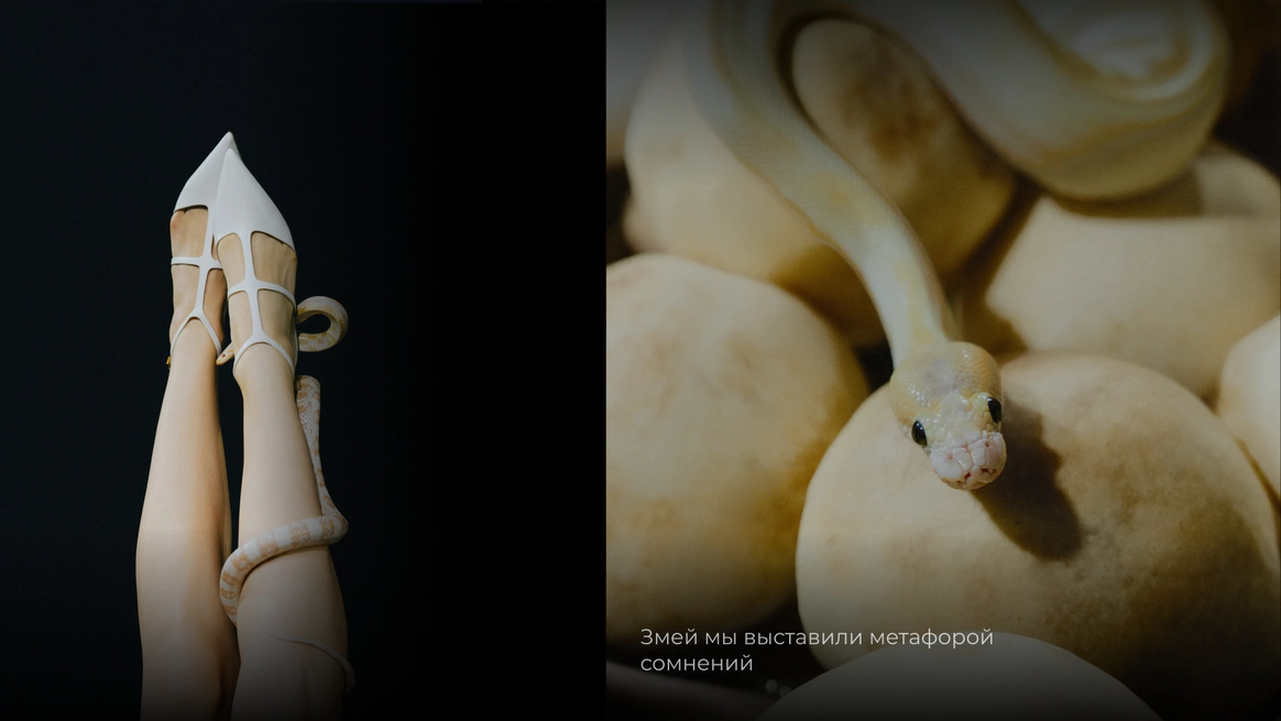 Начну с того, что герой, который орёт на первых кадрах, действительно боится змей. И мы это знали, когда брали его на съёмку. По моей задумке «Адам и Ева» должны были испытать настоящие эмоции, чтобы не врать зрителю. Поэтому в кадре всё настоящее: змеи, винтажная посуда, шкуры, яблоки-груши, крики и наши попытки уговорить героя потерпеть ещё пару дублей. Снимали в пустом ангаре, где мы постепенно собрали пространство райского сада так, что каждый ракурс открывал новую фактуру и оголял нерв, и проекта, и актёров.