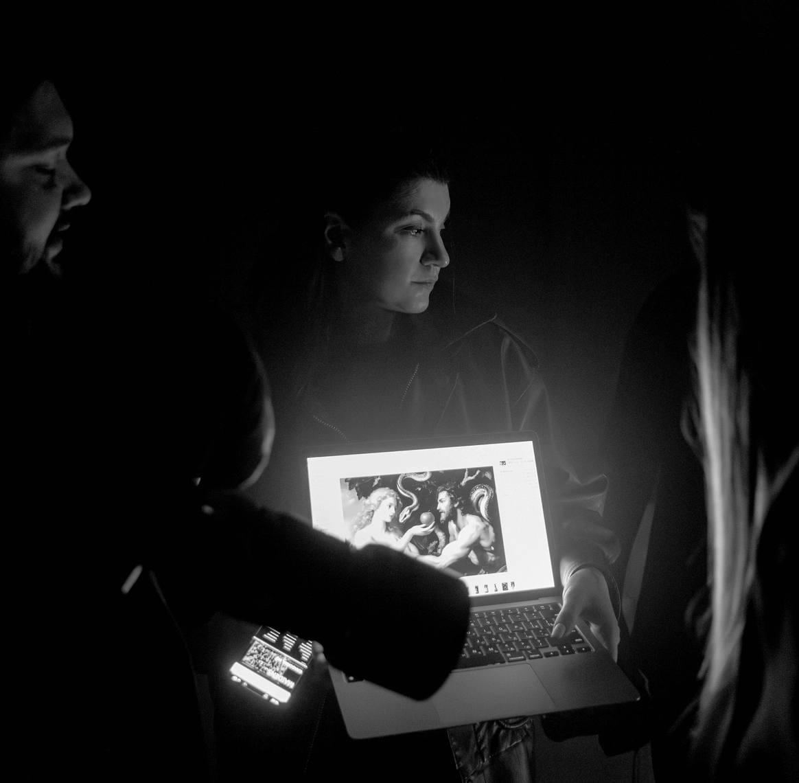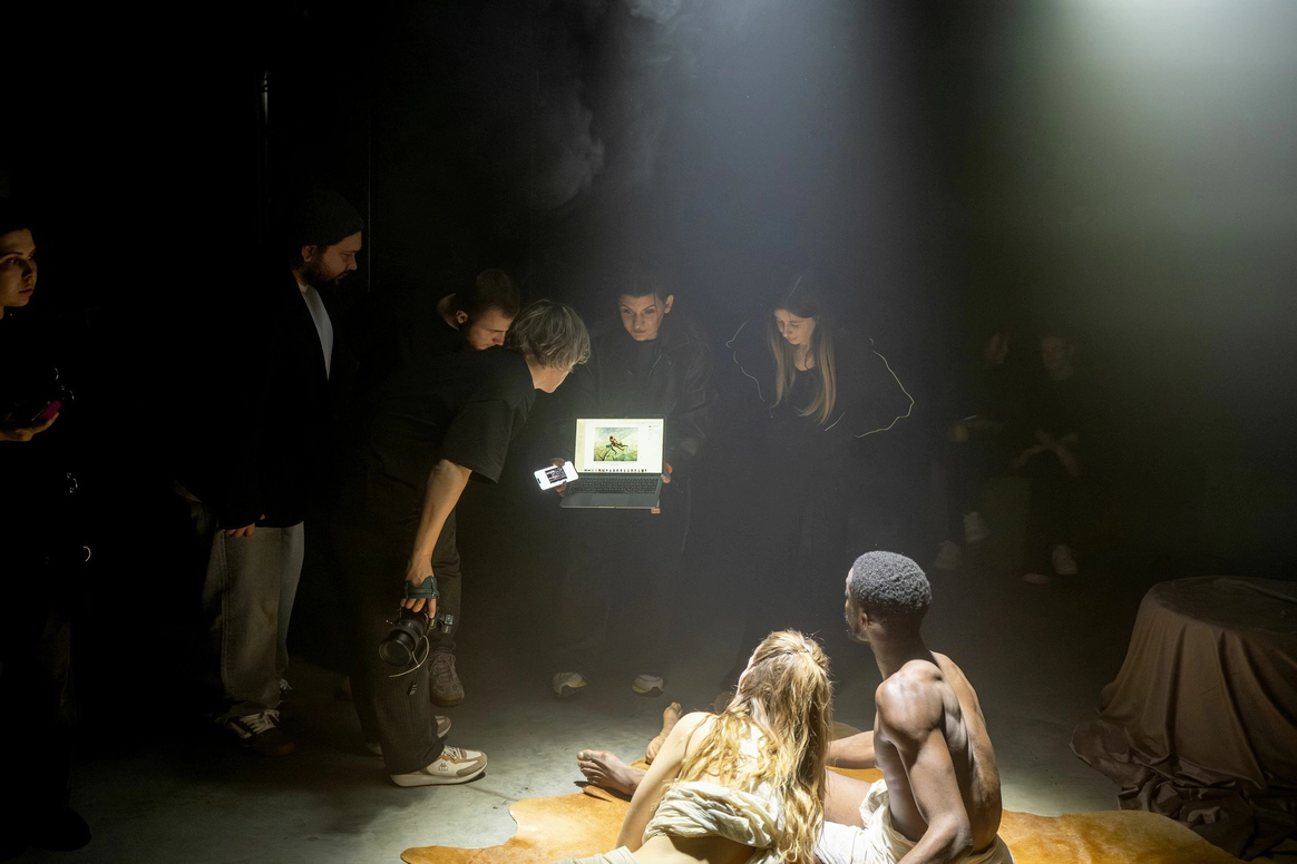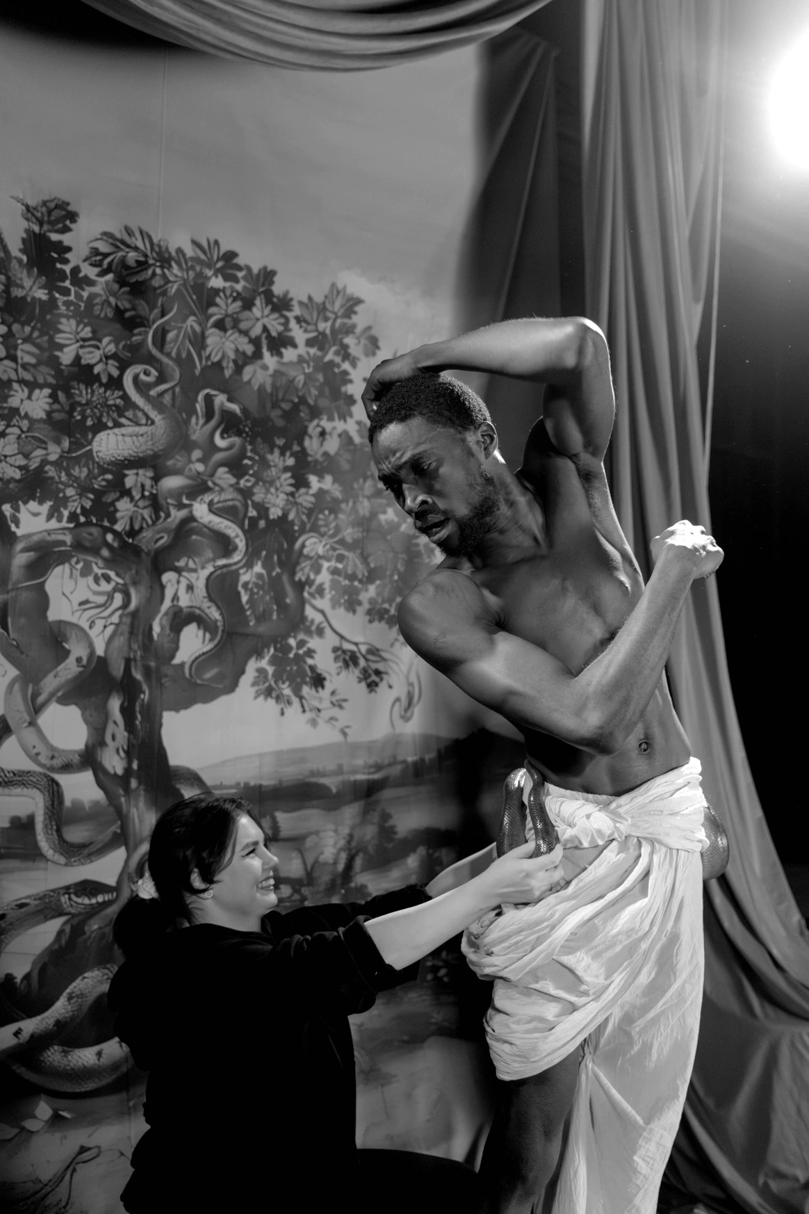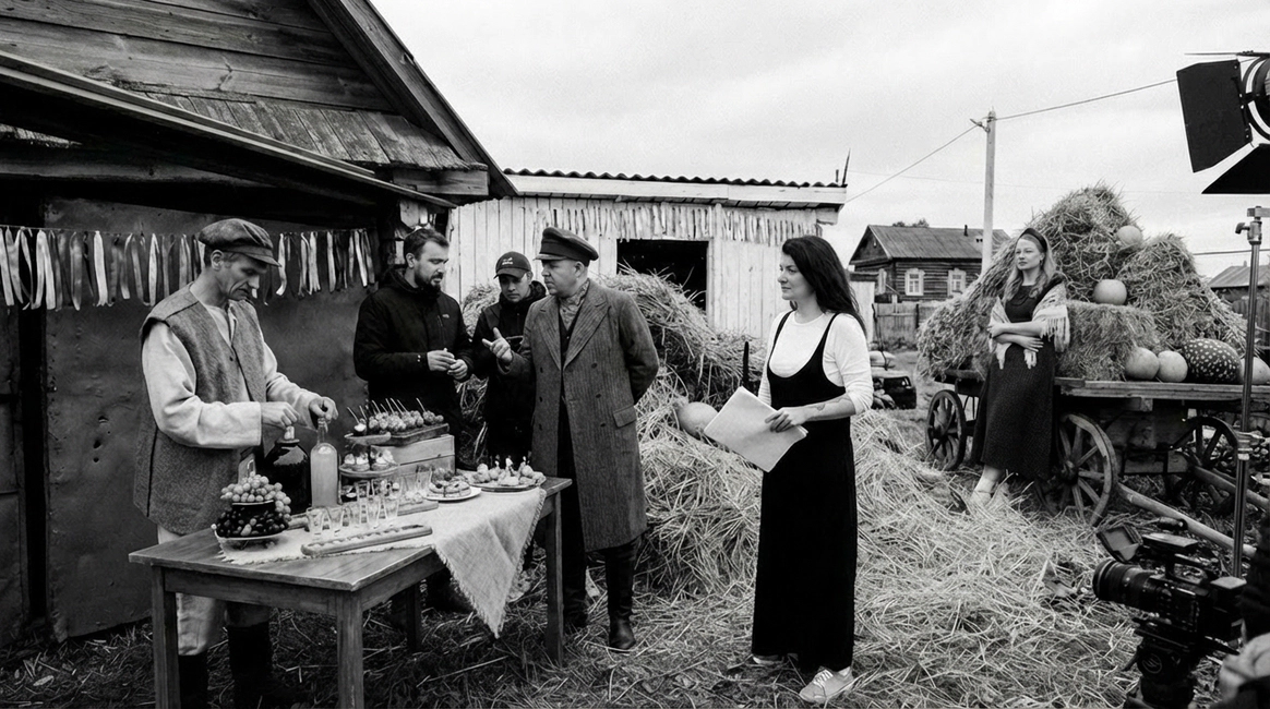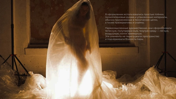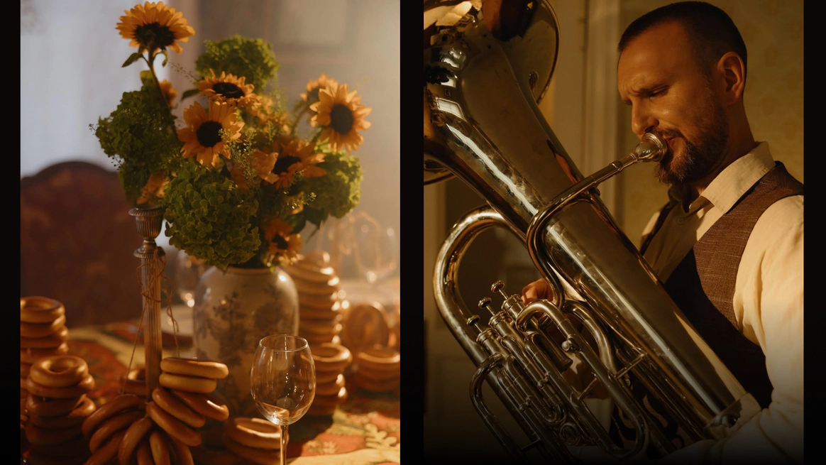 Начну с того, что герой, который орёт на первых кадрах, действительно боится змей. И мы это знали, когда брали его на съёмку. По моей задумке «Адам и Ева» должны были испытать настоящие эмоции, чтобы не врать зрителю. Поэтому в кадре всё настоящее: змеи, винтажная посуда, шкуры, яблоки-груши, крики и наши попытки уговорить героя потерпеть ещё пару дублей. Снимали в пустом ангаре, где мы постепенно собрали пространство райского сада так, что каждый ракурс открывал новую фактуру и оголял нерв, и проекта, и актёров.