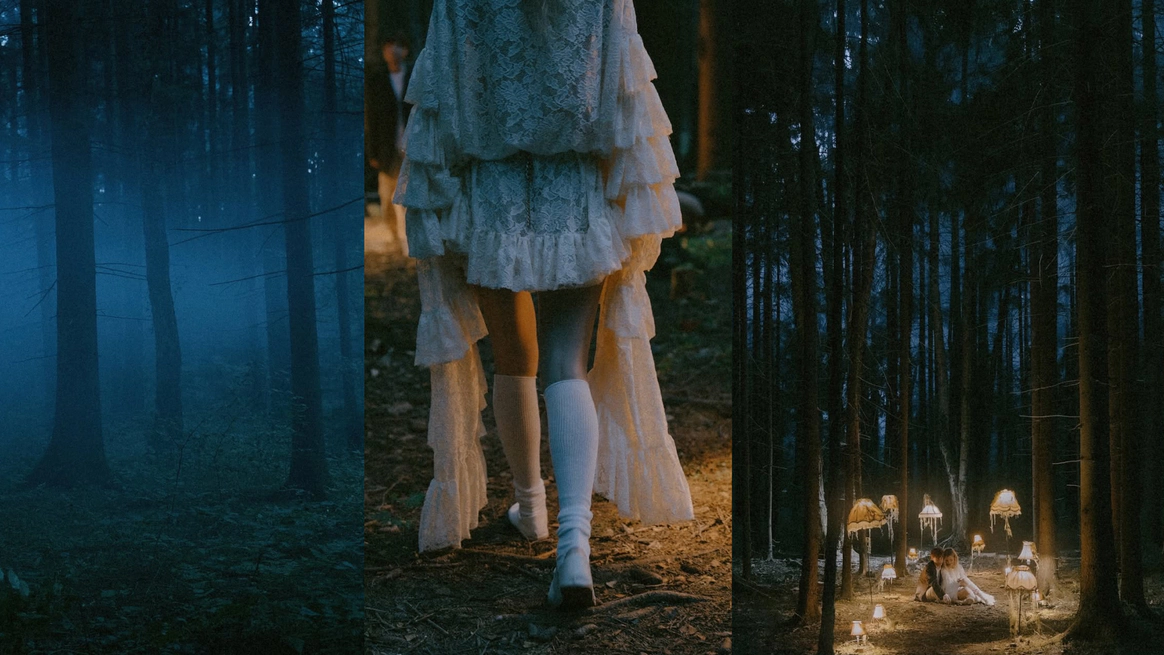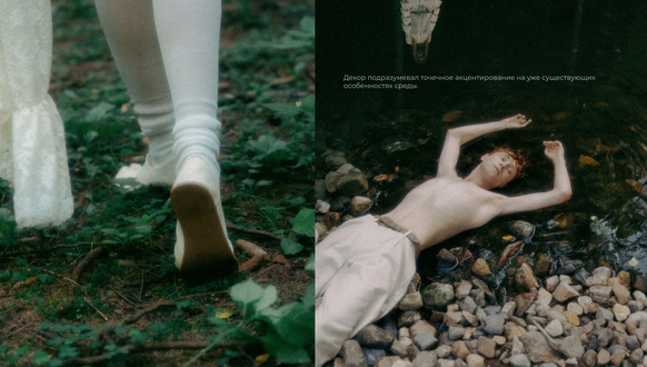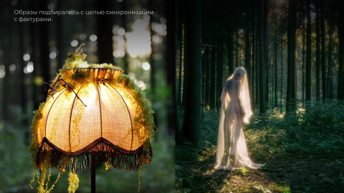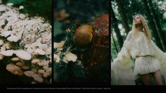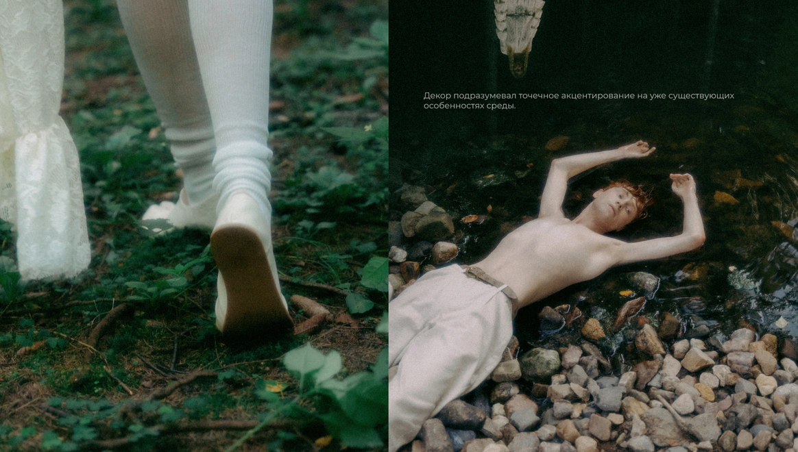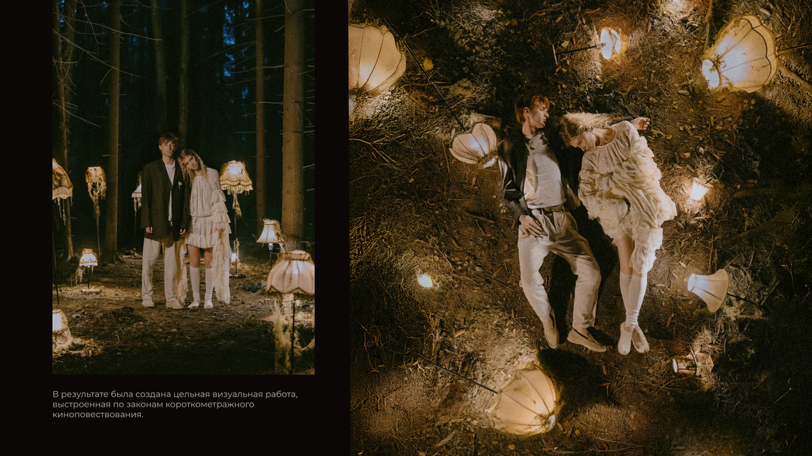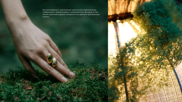 Этот проект снимался ночью в лесу, и по моей арт-директорской задумке лес тоже участвовал в съёмке. Мы притащили на себе старые лампы с киноскладов, генераторы и дымовые шашки с твёрдым намерением сделать густой туман как в кино. В какой-то момент в лесу стало настолько дымно, что к финалу съёмки приехал наряд полиции выяснять, что происходит. До их приезда нас уже успели покусать почти все местные насекомые. Зато у проекта появилась та самая «трушность» на ощупь: шероховатости деревьев, грибы, слизни, лягушки, влажная кора... Всё, что хотелось буквально тыкать руками.