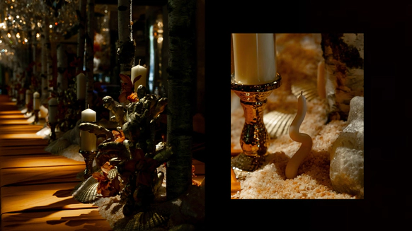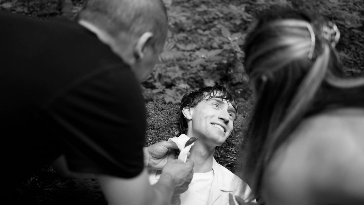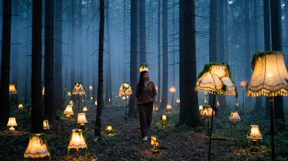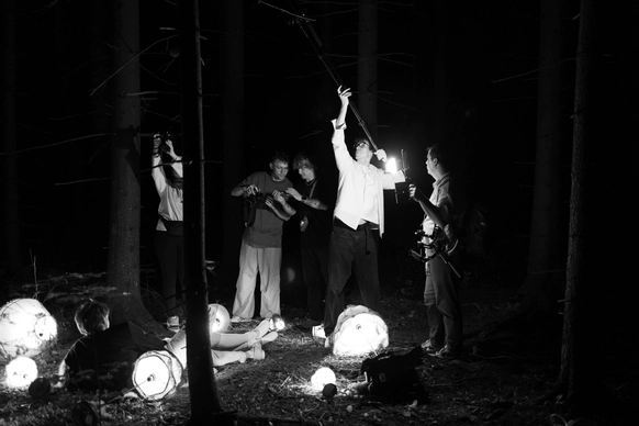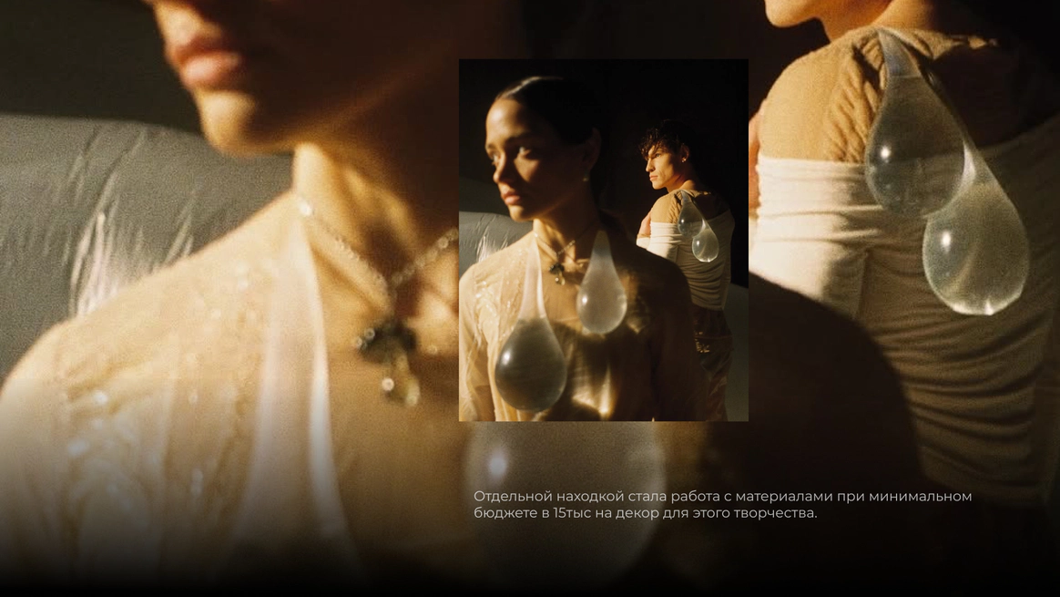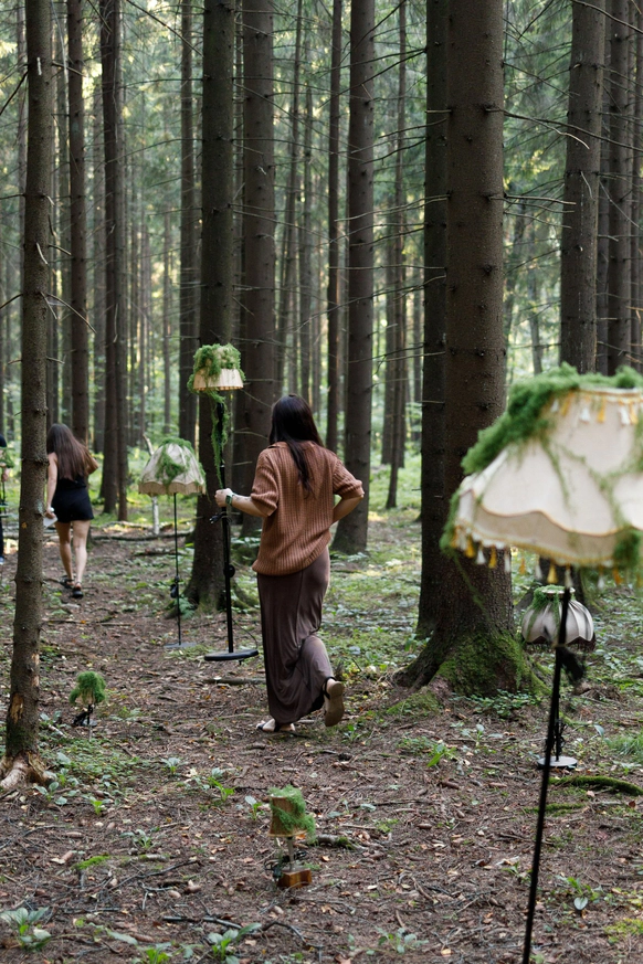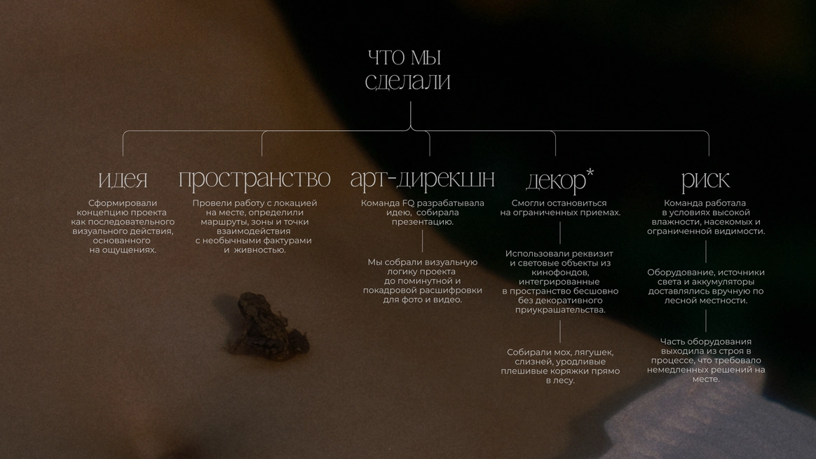 Этот проект снимался ночью в лесу, и по моей арт-директорской задумке лес тоже участвовал в съёмке. Мы притащили на себе старые лампы с киноскладов, генераторы и дымовые шашки с твёрдым намерением сделать густой туман как в кино. В какой-то момент в лесу стало настолько дымно, что к финалу съёмки приехал наряд полиции выяснять, что происходит. До их приезда нас уже успели покусать почти все местные насекомые. Зато у проекта появилась та самая «трушность» на ощупь: шероховатости деревьев, грибы, слизни, лягушки, влажная кора... Всё, что хотелось буквально тыкать руками.