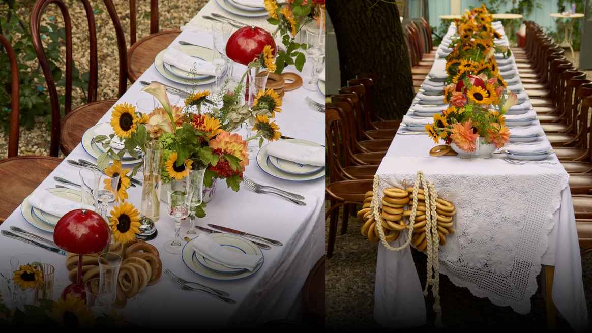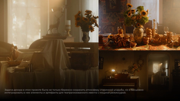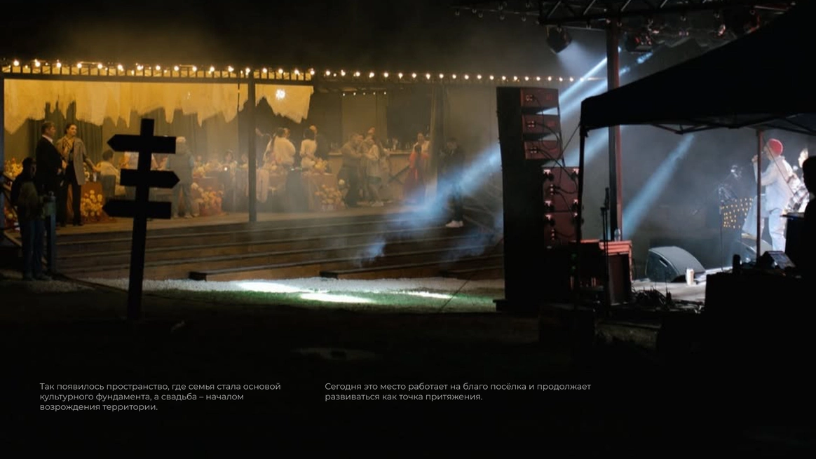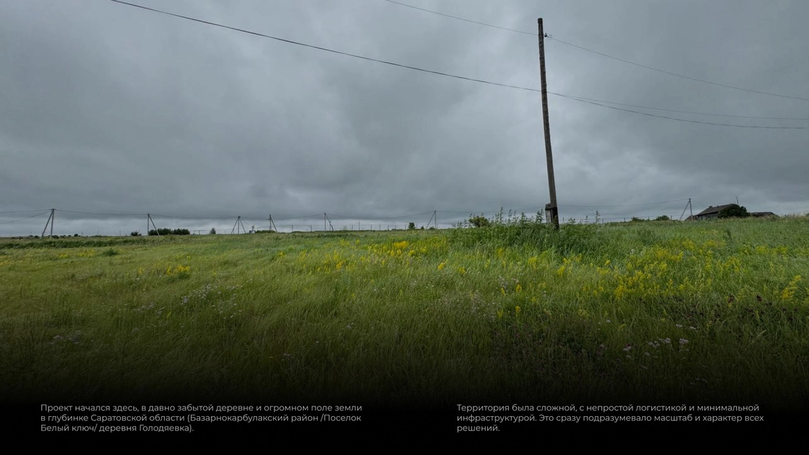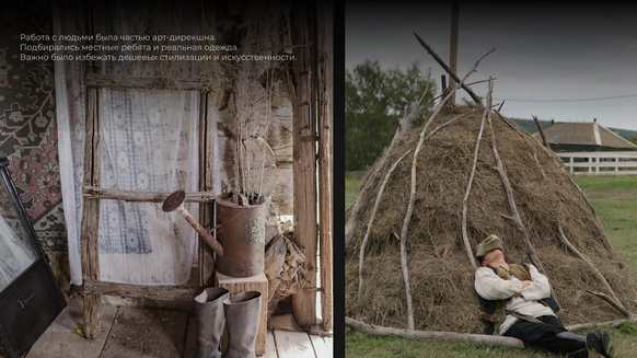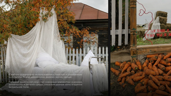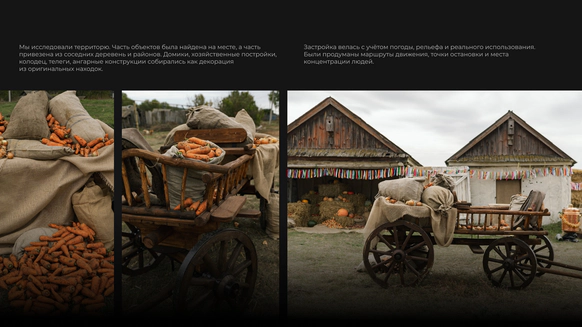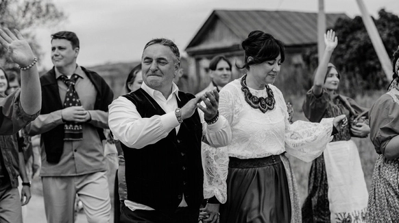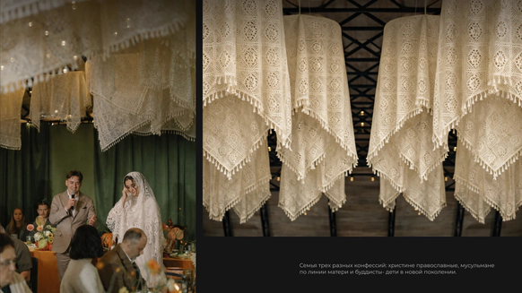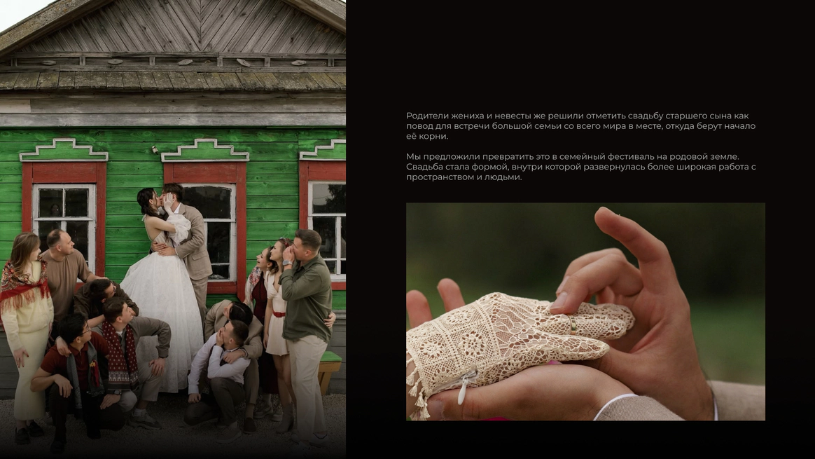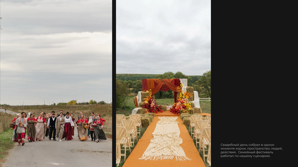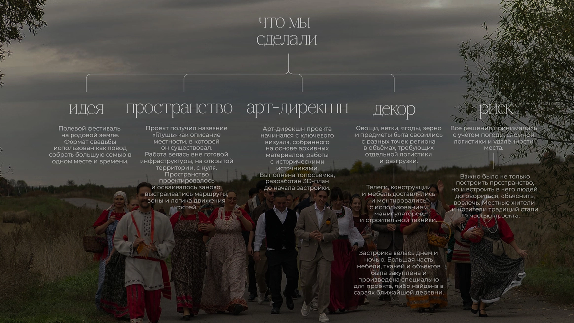 Эта свадьба начиналась с абсолютно пустого поля в Саратовской области и пары заброшенных, покосившихся домиков (даже без туалета). Мы буквально собирали деревню голыми руками: привозили манипуляторами старые хоз постройки из соседних деревень, ставили беседку, колодцы, таскали стога, кровати, телеги, зеркала и тонны овощей мешками. Семья хотела возродить это место, чтобы оно осталось потом как родовое гнездо и часть истории этой территории. В итоге туда съехались люди со всего мира: те, кто когда-то жил здесь, и те, чьи семьи отсюда родом. На один день это поле снова стало деревней.