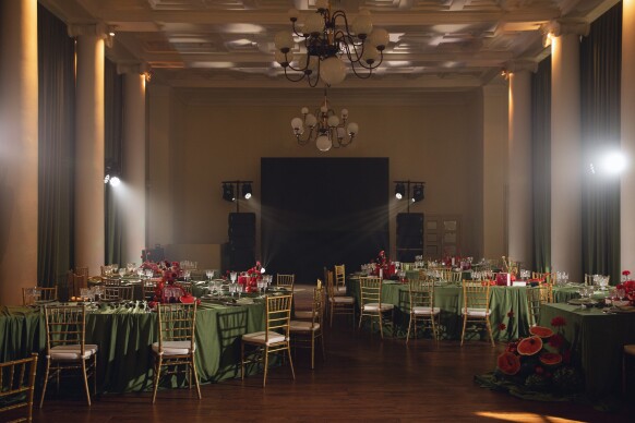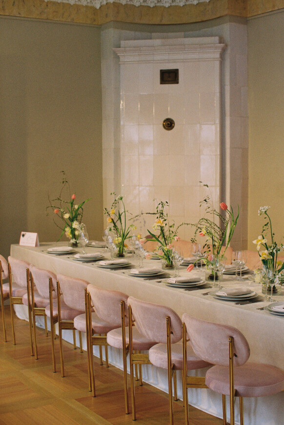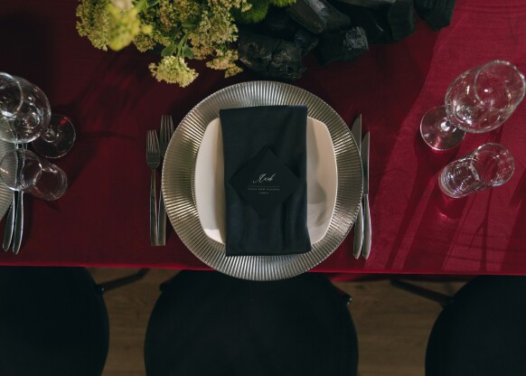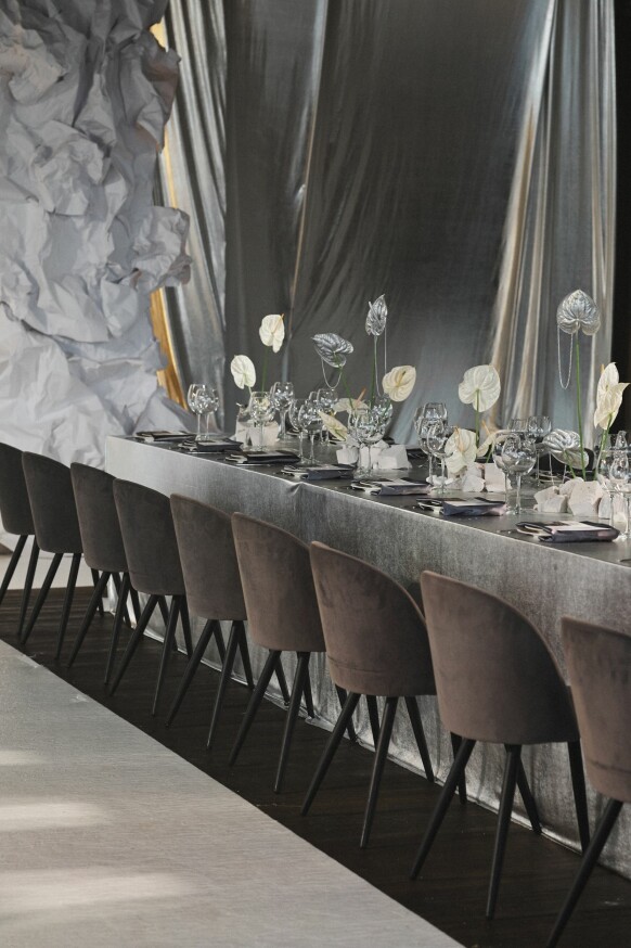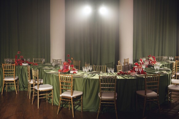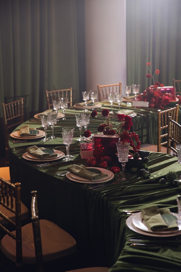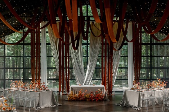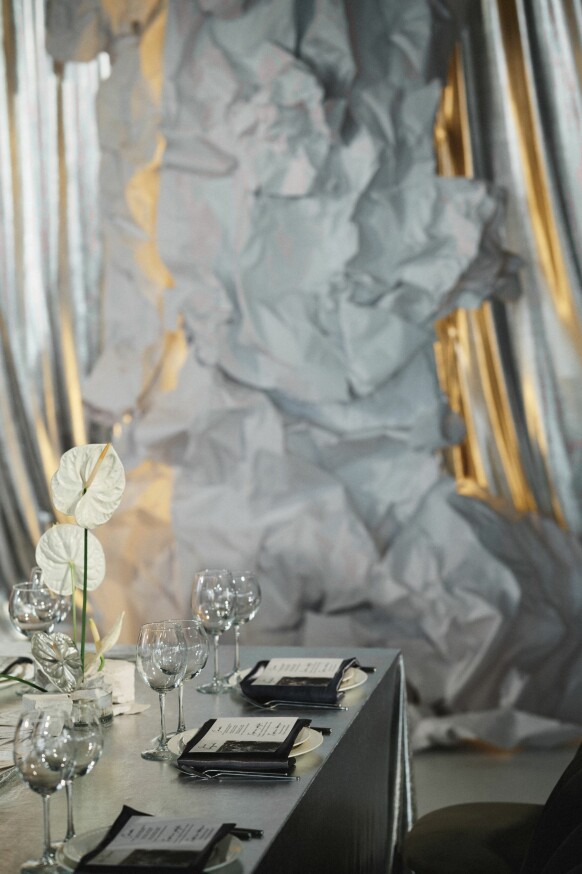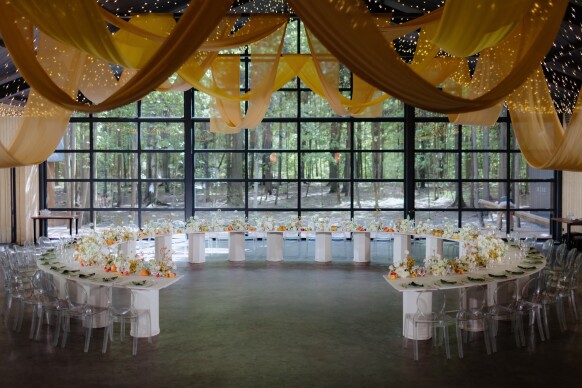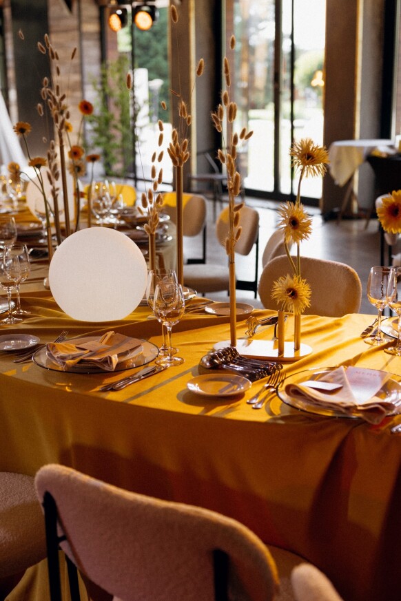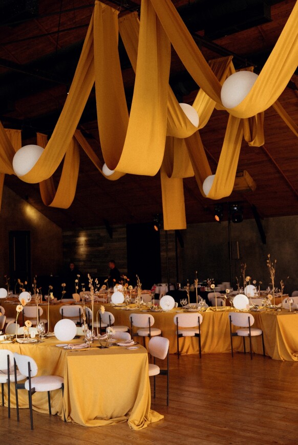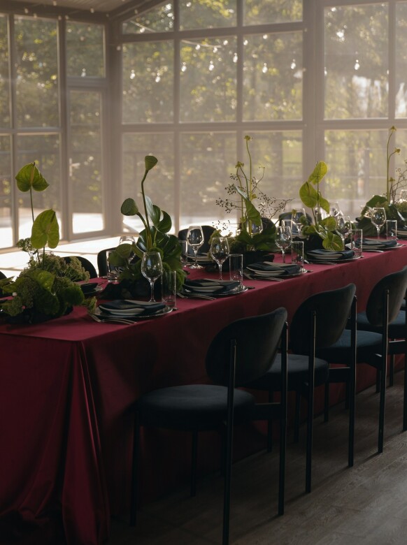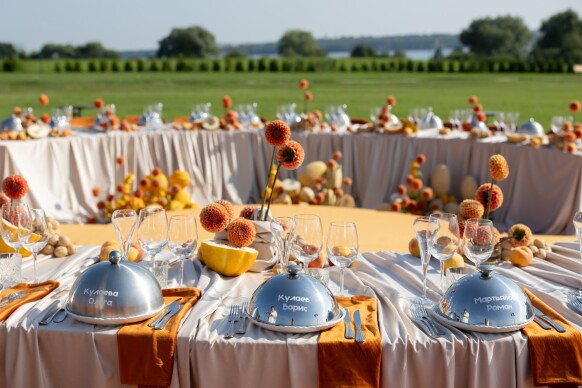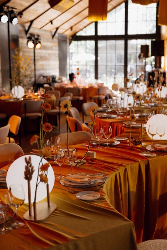 Задачи: минималистичная флористика, сложная схема рассадки гостей, использовать цвет - как основной декоративный инструмент.