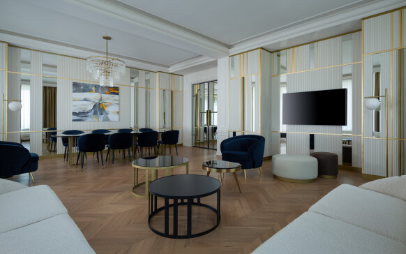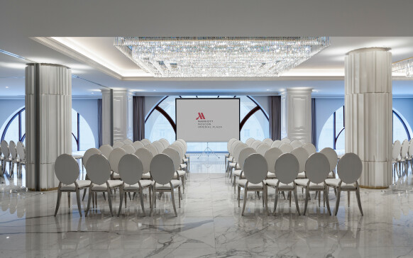 О ПЛОЩАДКЕ Moscow Marriott Imperial Plaza – безупречный пятизвездочный отель, расположенный в центре Москвы. Его по праву можно назвать настоящим шедевром архитектуры. Элегантный интерьер, выполненный в стиле ар-деко, геометрические орнаменты, глянцевые текстуры, лепнина, хрусталь и мрамор создают атмосферу роскоши и изящества. В отеле 268 номеров и люксов, ресторан авторской Cafe Imperial, фитнес-центр, а также ультрасовременные банкетные и конференц-залы. Отель Moscow Marriott Imperial Plaza открылся в декабре 2021 года, но уже успел стать одной из самых желанных московских локаций для незабываемого отдыха, роскошных свадеб, а также масштабных мероприятий. У отеля выигрышное расположение в центральной части города, недалеко от Комсомольской площади и Кольцевой линии московского метро. ТОРЖЕСТВО Банкетный зал Imperial Plaza – уникальная площадка для самых незабываемых торжеств, площадью 800 кв. метров и вместимостью до 550 человек (банкетной рассадкой) и до 1000 человек (рассадкой «театр»). Интерьер банкетного зала впечатляет элегантными интерьерами: хрустальные итальянские люстры, витражи, высокие потолки и зеркала, расширяющие пространство. В вечернее время хрустальные люстры добавляют в пространство теплое освещение. Королевский размах пространству обеспечивают потолки высотой 6.5 метров. Изящная лепнина и паркет из 16 пород дерева делают интерьер Imperial Plaza особенно роскошным. ВОЗМОЖНОСТИ ДЛЯ ПРОВЕДЕНИЯ МЕРОПРИЯТИЙ Технические возможности банкетного зала не ограничивают желания гостей и способствуют проведению мероприятий любого масштаба. Пространство легко превращается в 3 конференц-комнаты с помощью раздвижных стен-ширм, а благодаря новейшему акустическому оснащению и сцене-трансформер банкетный зал может стать полноценной концертной площадкой. Для проведения бизнес-мероприятий до 150 человек в отеле предусмотрены 8 конференц-залов, соответствующие всем необходимым техническим требованиям для проведения деловых встреч, профессиональных конференций и грандиозных общественных мероприятий. Отличительная особенность – передвижные перегородок, которые трансформируют конференц-залы в единое пространство. Президентский номер Imperial Suite – еще одна уникальная локация отеля, которая идеально подходит для проведения камерных мероприятий. Интерьер номера выполнен в стиле ар-деко, что позволило Люксу не только подчеркнуть общую концепцию отеля, но и стать поистине одним из его главных достояний. Изумительные хрустальные люстры, сдержанные полутона, лаконичная мебель, авторские картины и изящные предметы интерьера. 160-метровый Imperial Suite располагает двумя спальными комнатами с кроватями king, просторной гостиной с панорамным видом на Москву, полностью оборудованной кухней и даже отдельным входом для персонала. В Люксе возможно не только полноценно отдохнуть в атмосфере роскоши и изящества, но и провести камерное мероприятие, будь то свадьба в узком семейном кругу или коктейльный прием до 20 человек. БАНКЕТНОЕ МЕНЮ В Moscow Marriott Imperial Plaza удивляют не только элегантные интерьеры, живописная атмосфера и уникальная технологическая оснащенность, но и шедевры кулинарного искусства от Шеф-повара Абдессатара Зитуни. Для каждого мероприятия Шеф-повар разрабатывает специальное меню, покоряя гостей кулинарными шедеврами и эксклюзивной подачей. В то же время банкетная сл