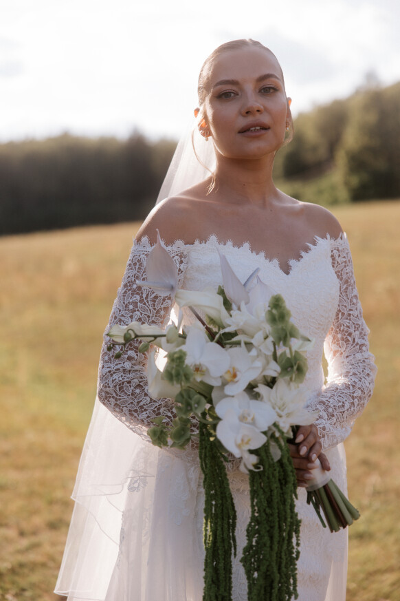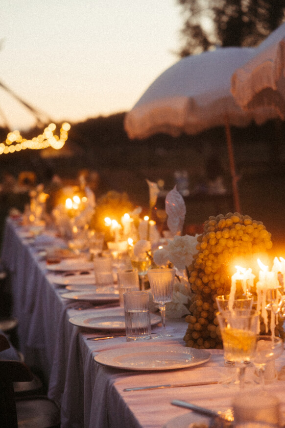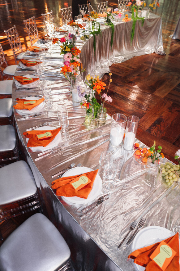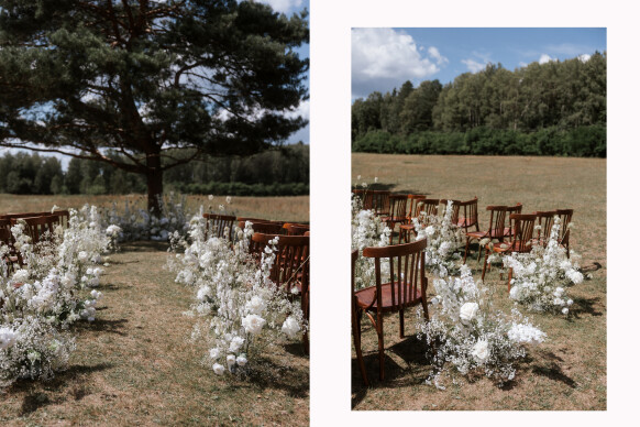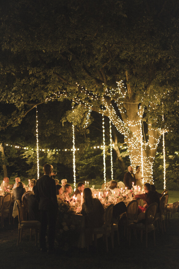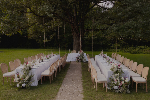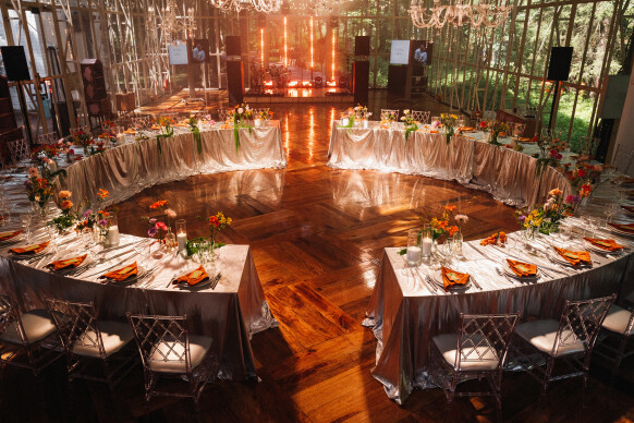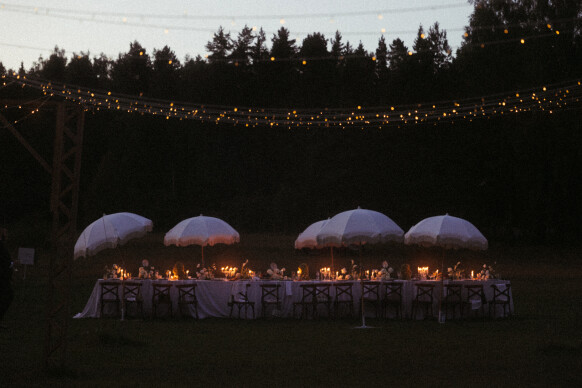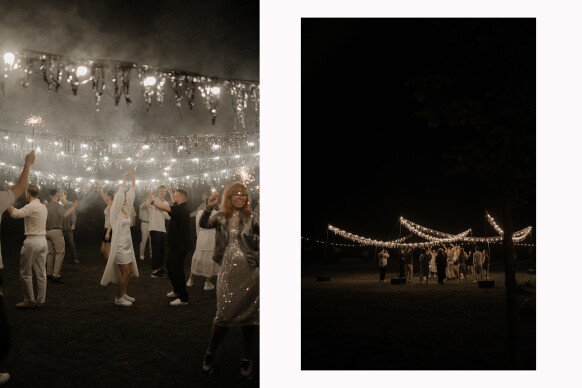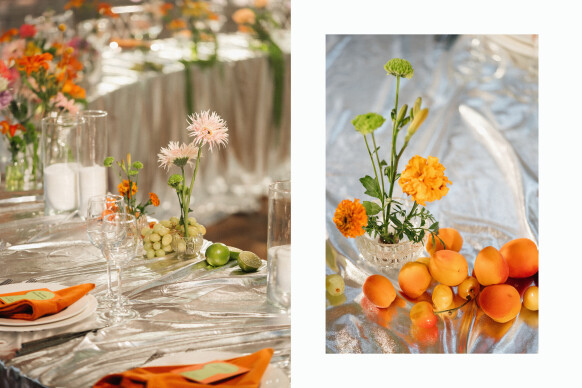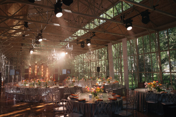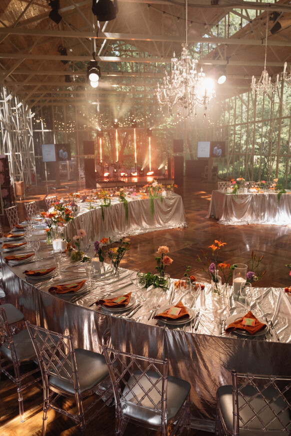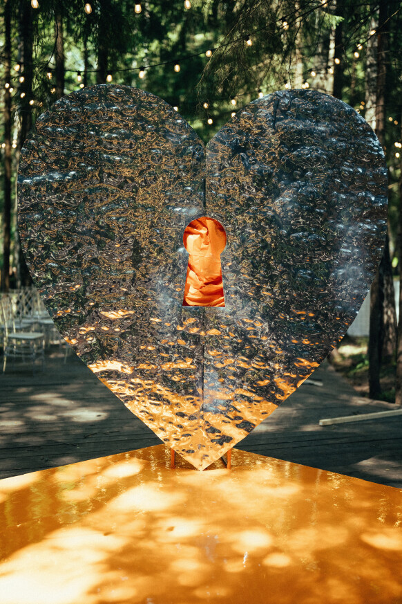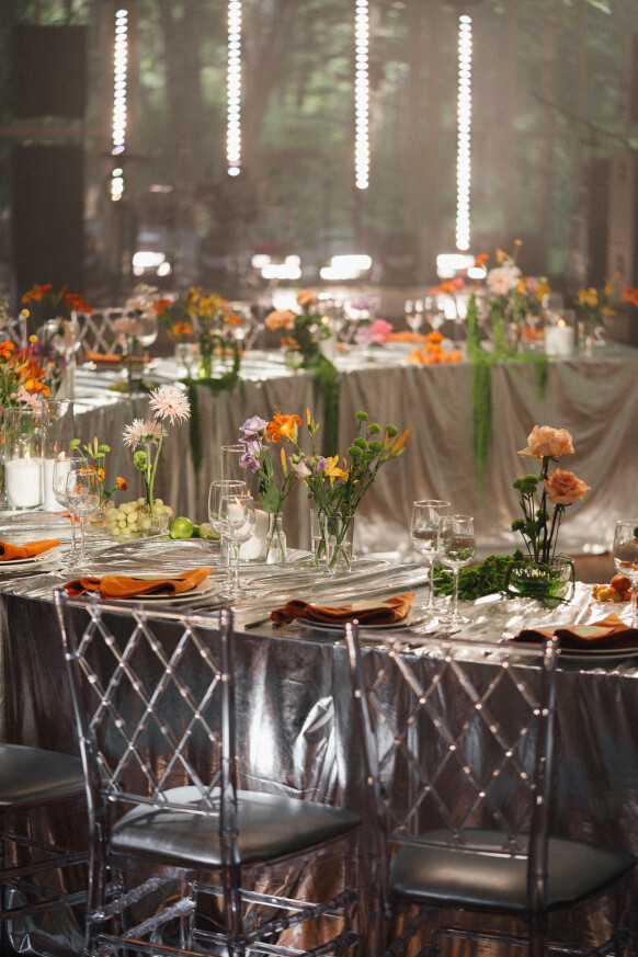 Никакой традиционной рассадки в банкетном зале — вместо этого два стола полумесяца с серебристыми скатертями. Никаких формальностей, никаких криков «Горько!» — только близкие люди, танцы на траве и мурашки от общего исполнения «Сансары».