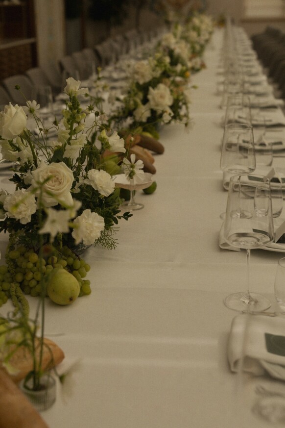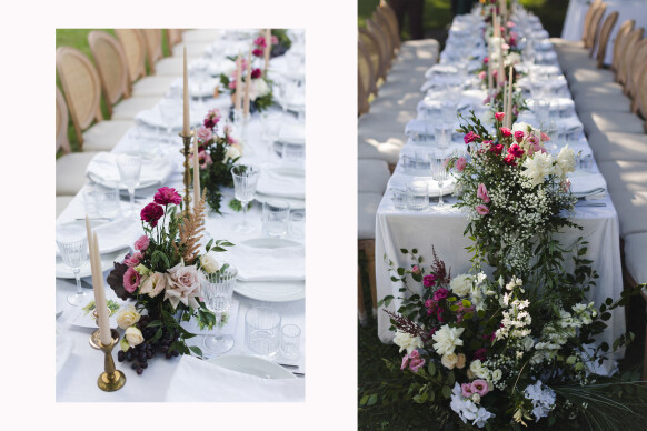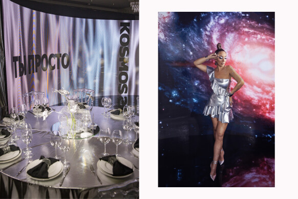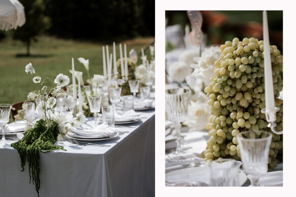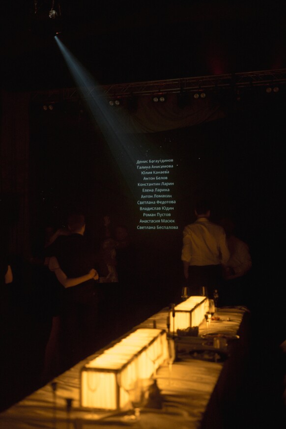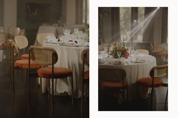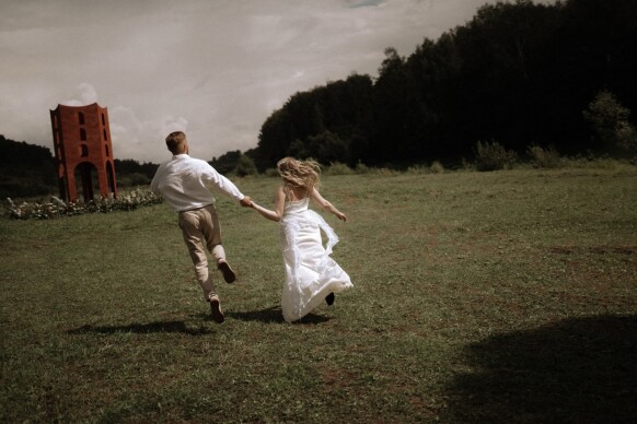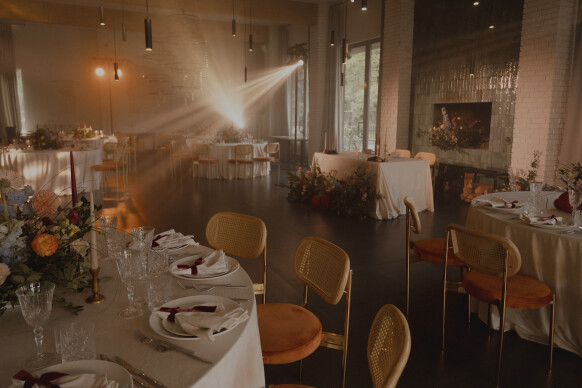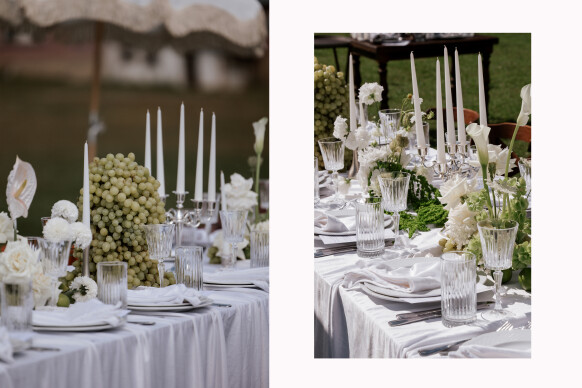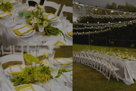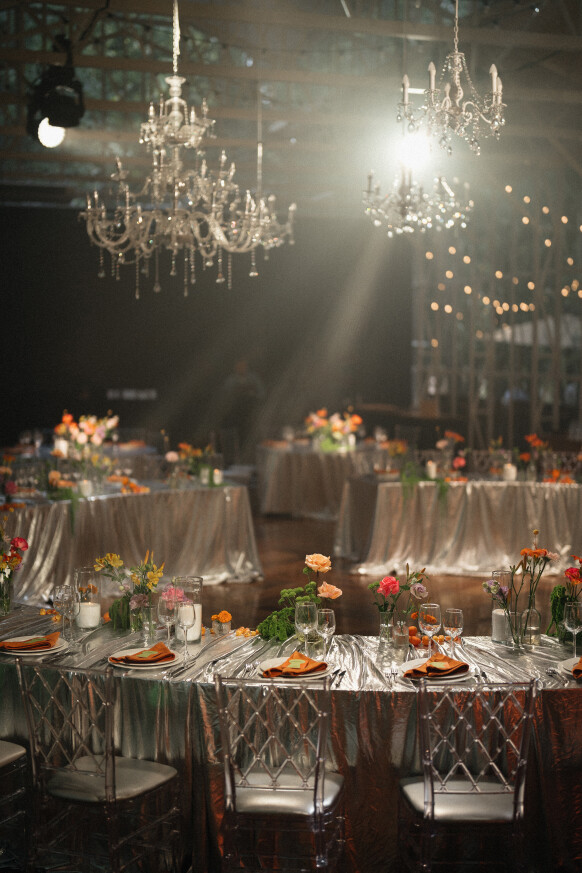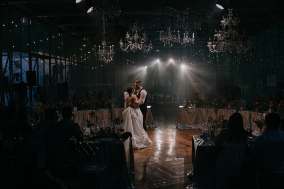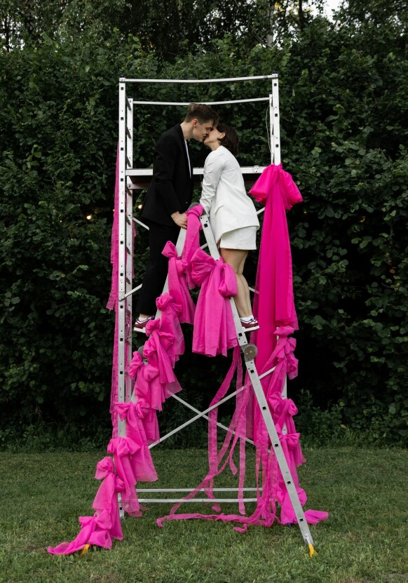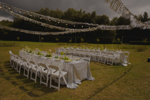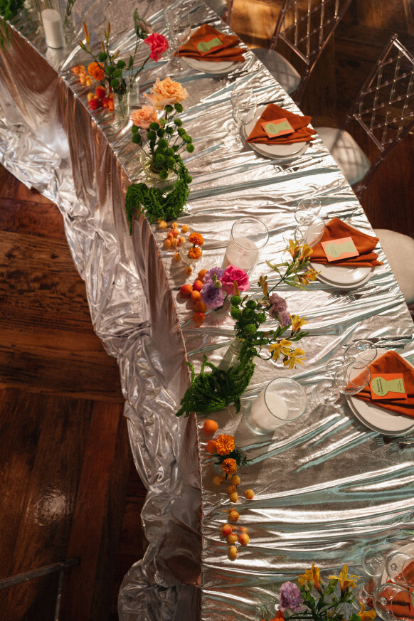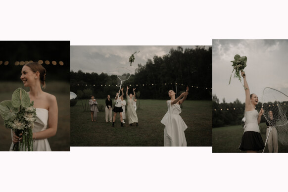 Никакой традиционной рассадки в банкетном зале — вместо этого два стола полумесяца с серебристыми скатертями. Никаких формальностей, никаких криков «Горько!» — только близкие люди, танцы на траве и мурашки от общего исполнения «Сансары».
