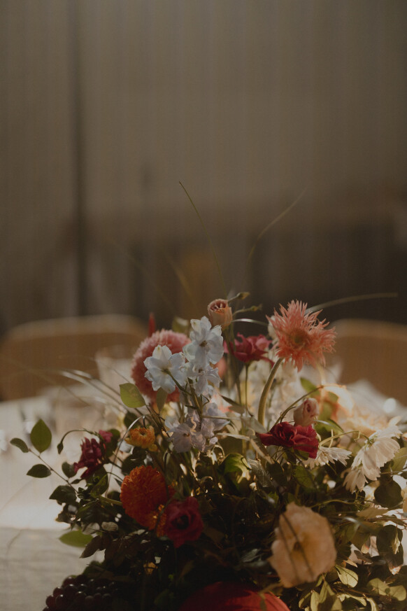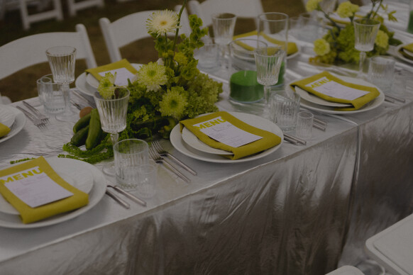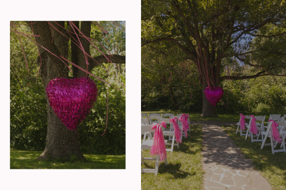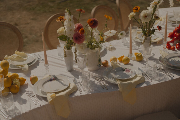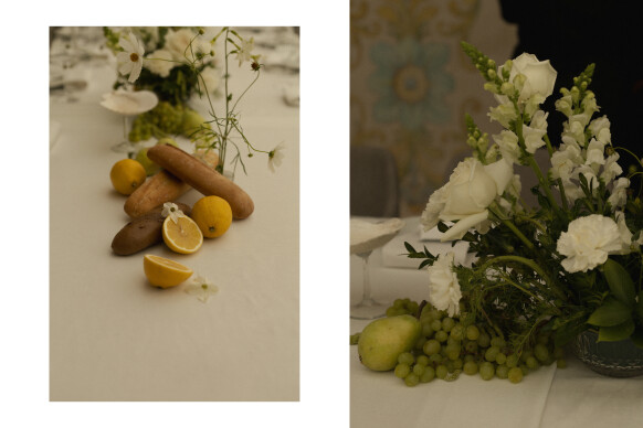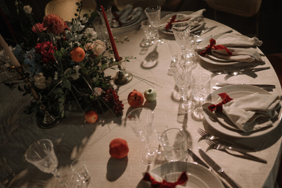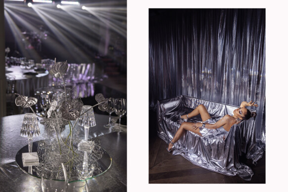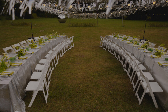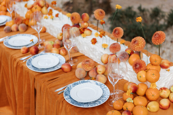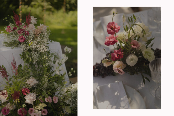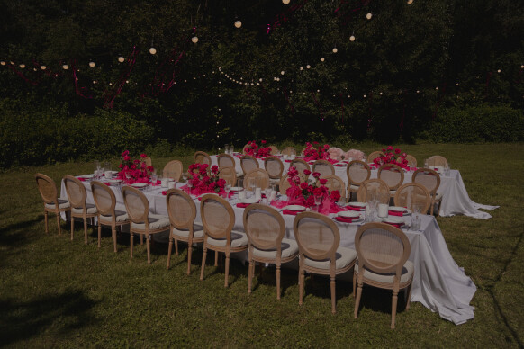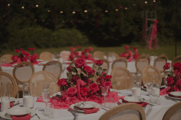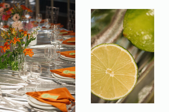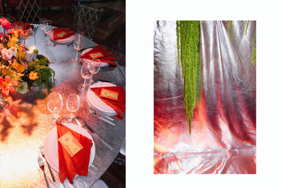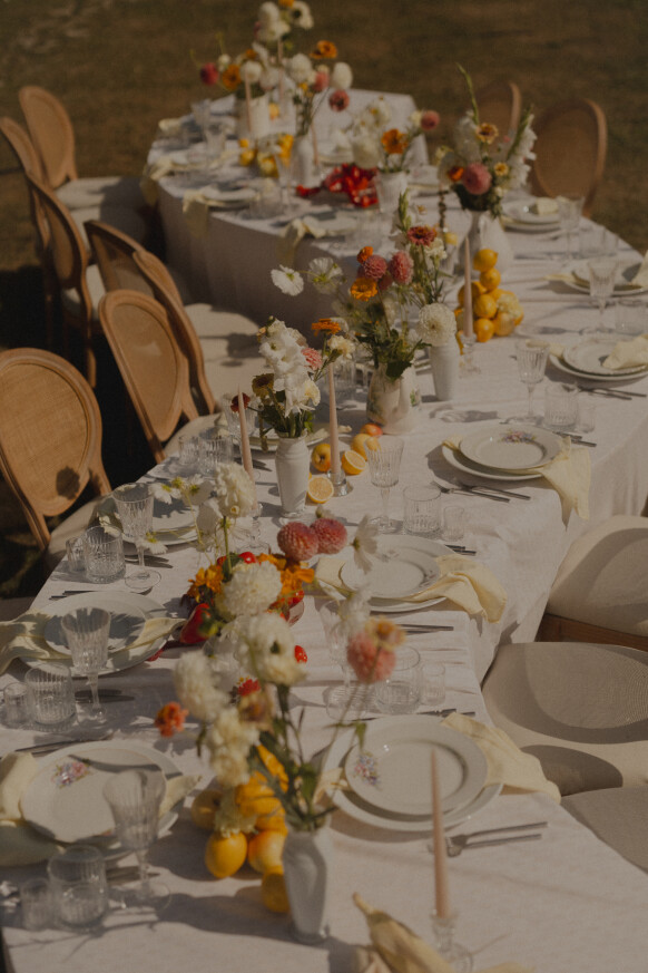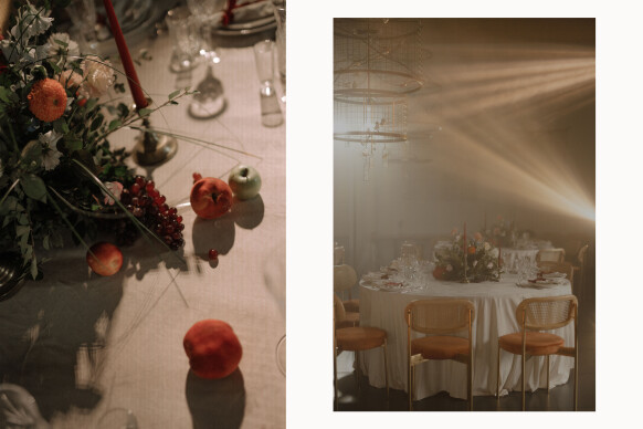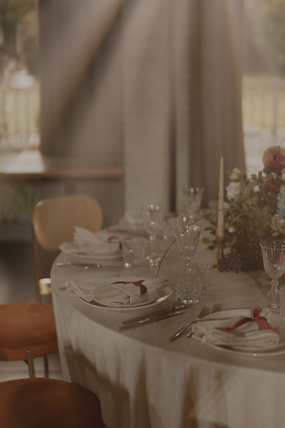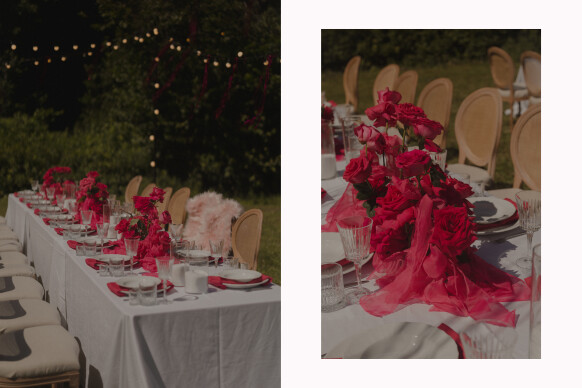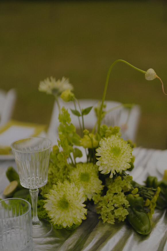 Никакой традиционной рассадки в банкетном зале — вместо этого два стола полумесяца с серебристыми скатертями. Никаких формальностей, никаких криков «Горько!» — только близкие люди, танцы на траве и мурашки от общего исполнения «Сансары».