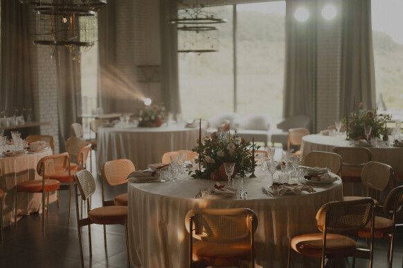 А еще для этой площадки мы изготовили полукруглые столы, за которыми рассадили пару и их друзей, а родителей разместили за круглые.