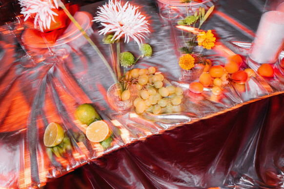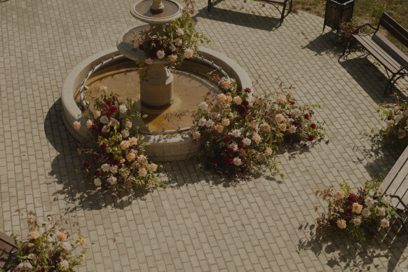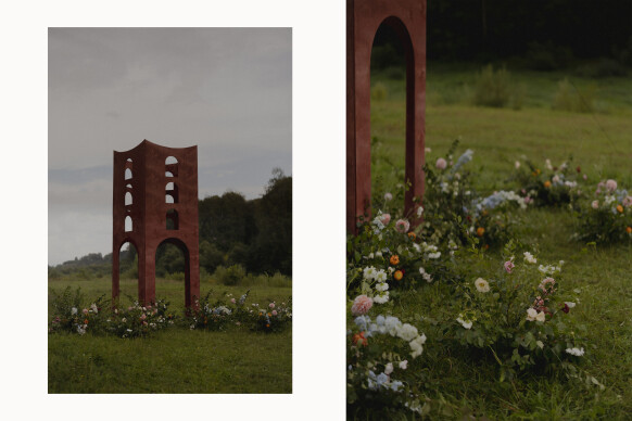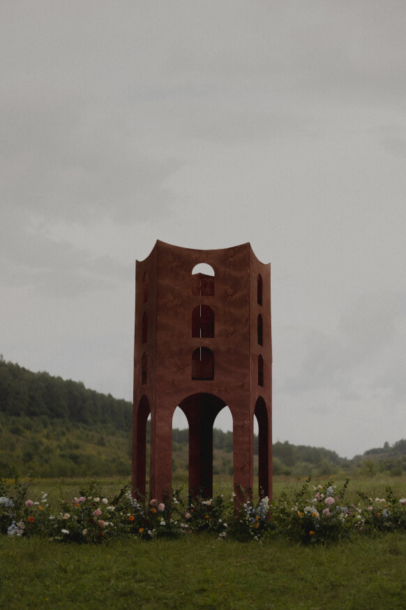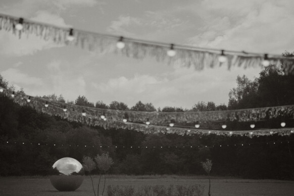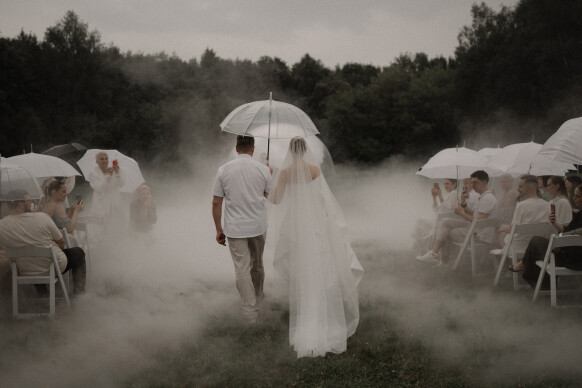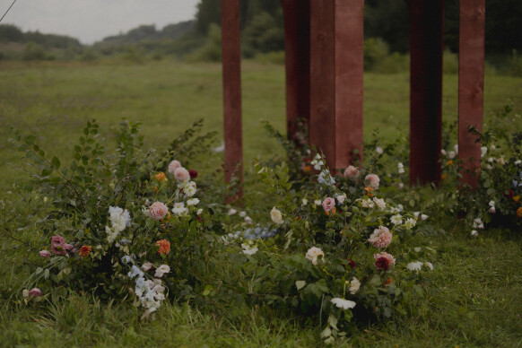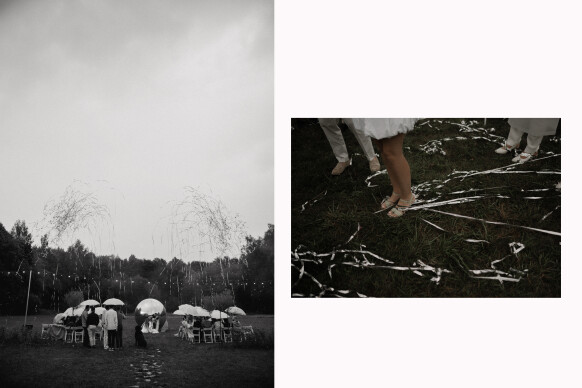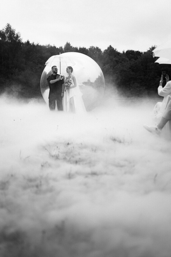 Дождь, которого все боялись, в итоге только добавил волшебства: гости стояли под зонтами, а тяжелый дым стелился по траве, сквозь который пробивались цветы.