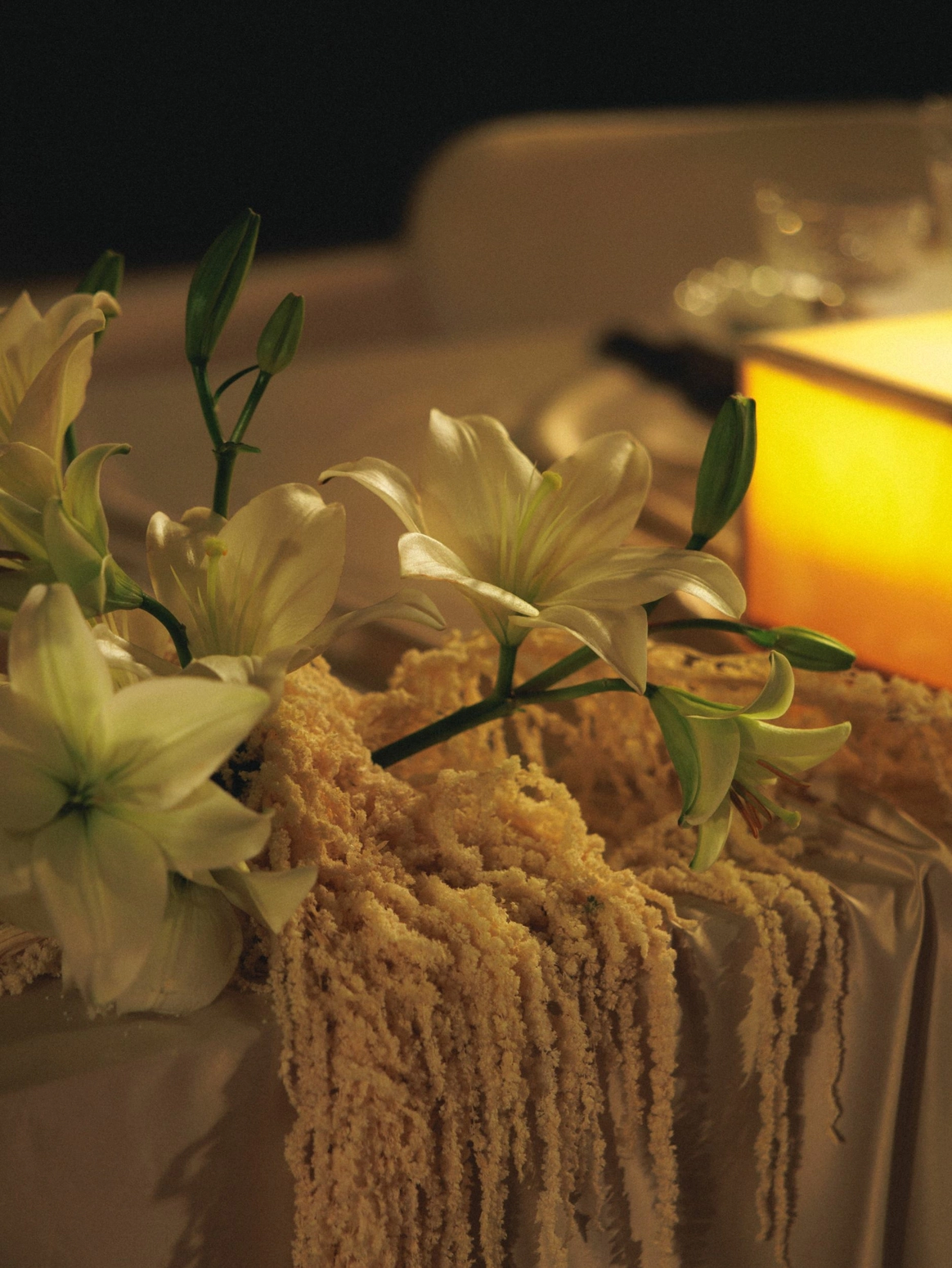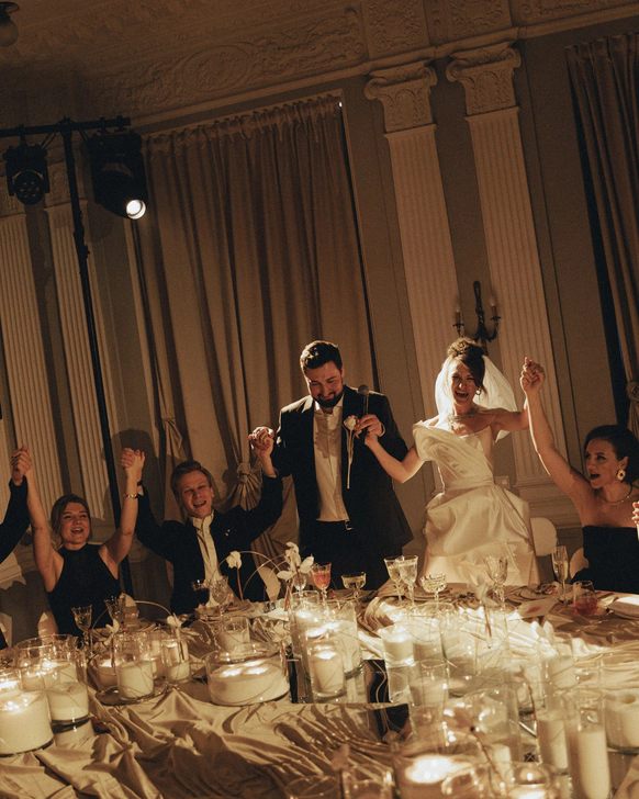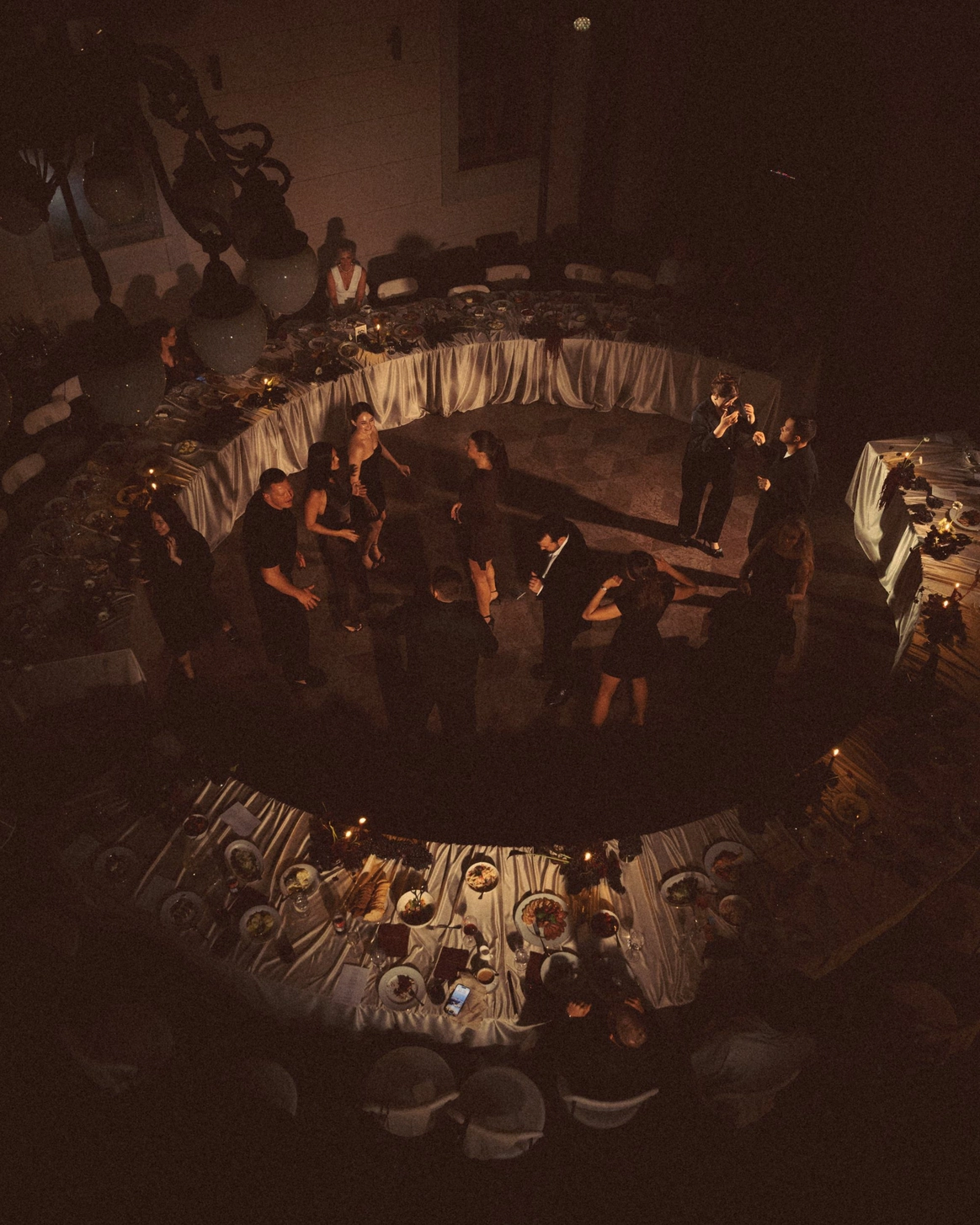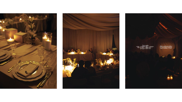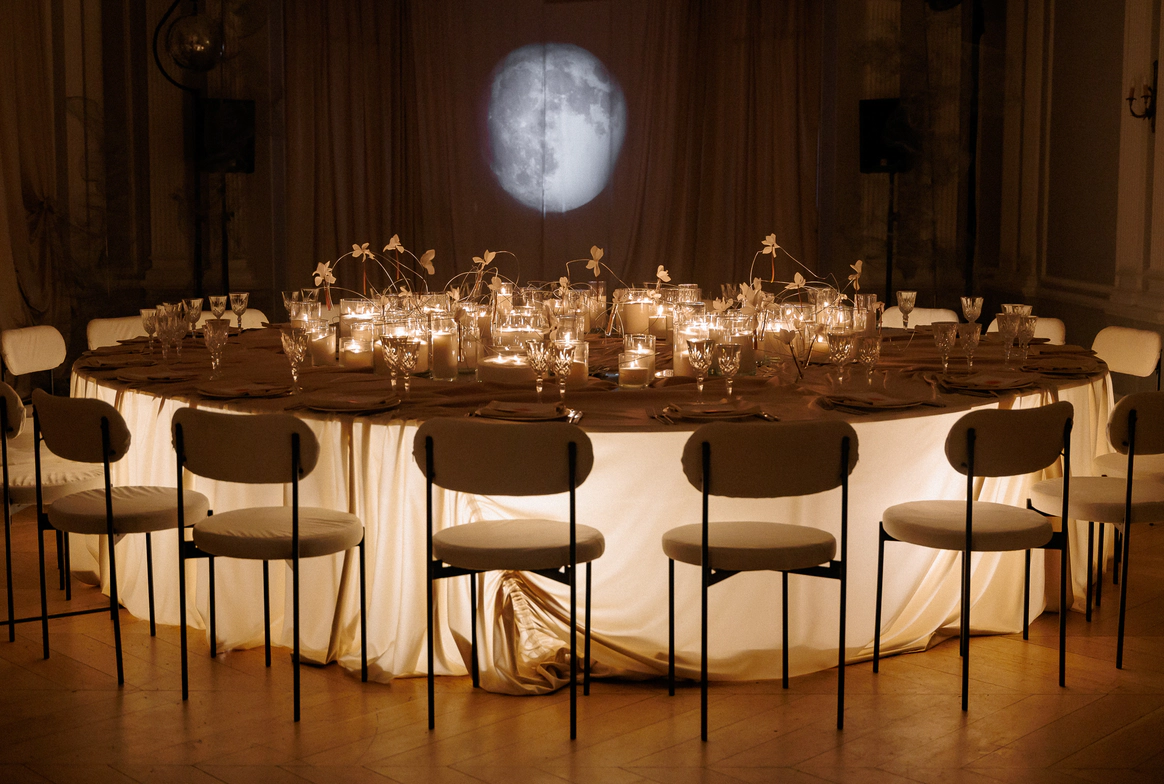В зале, изменённом до неузнаваемости, центром притяжения становится большой круглый стол. Мягко ниспадающий молочный текстиль отражает теплый свет свечей, усиливая ощущение тактильности.