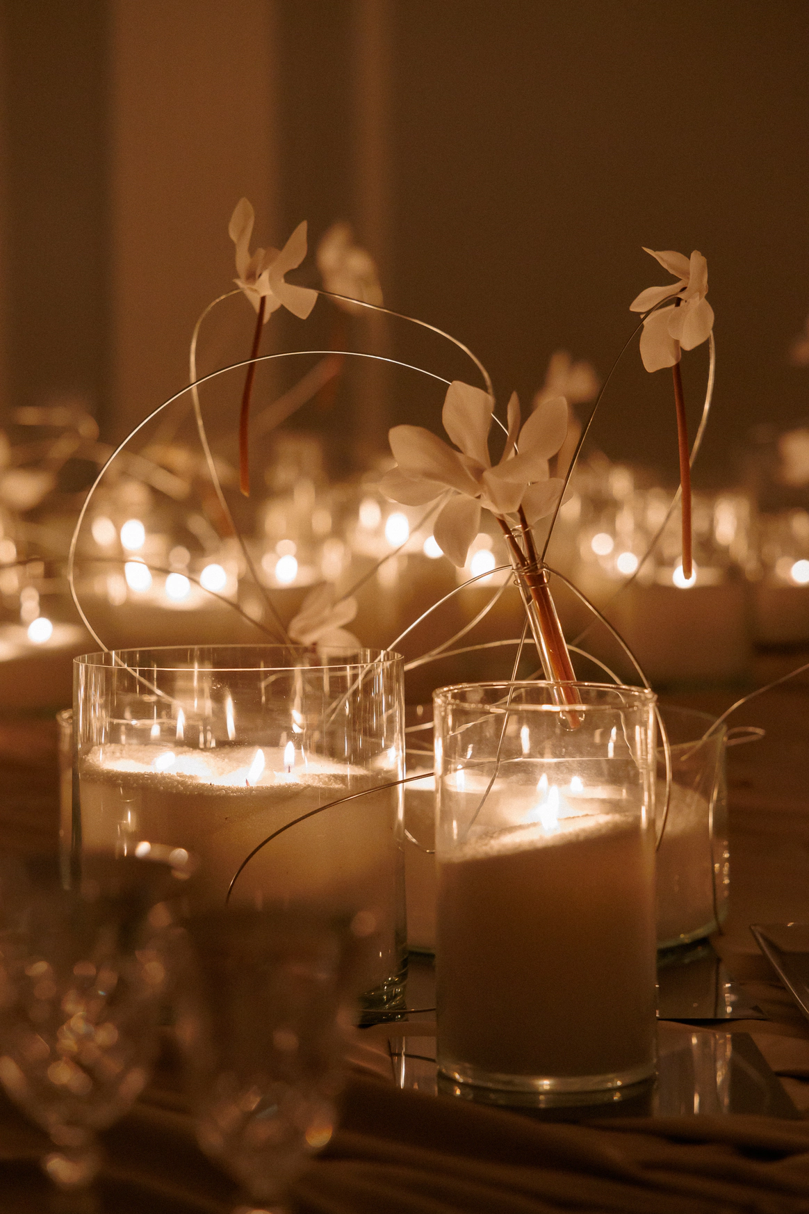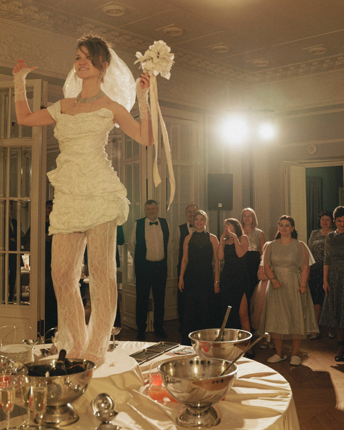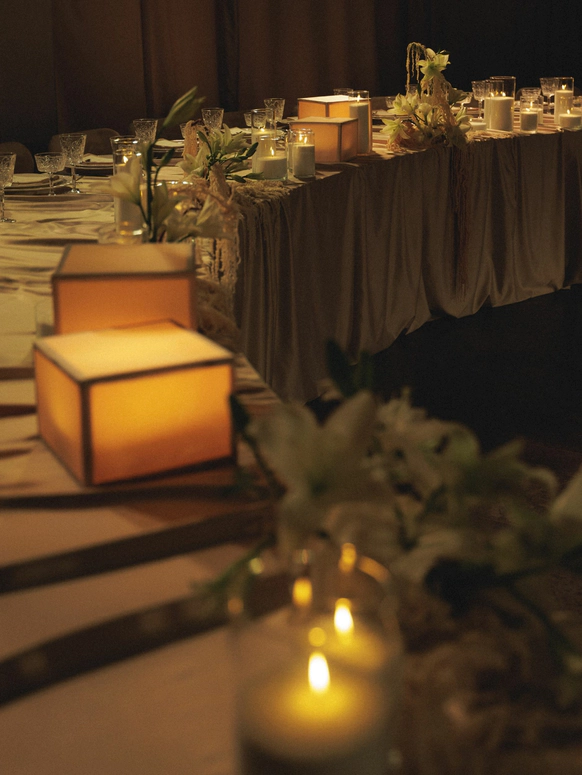 В зале, изменённом до неузнаваемости, центром притяжения становится большой круглый стол. Мягко ниспадающий молочный текстиль отражает теплый свет свечей, усиливая ощущение тактильности.