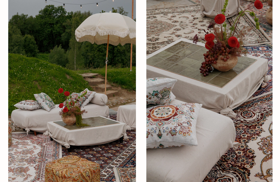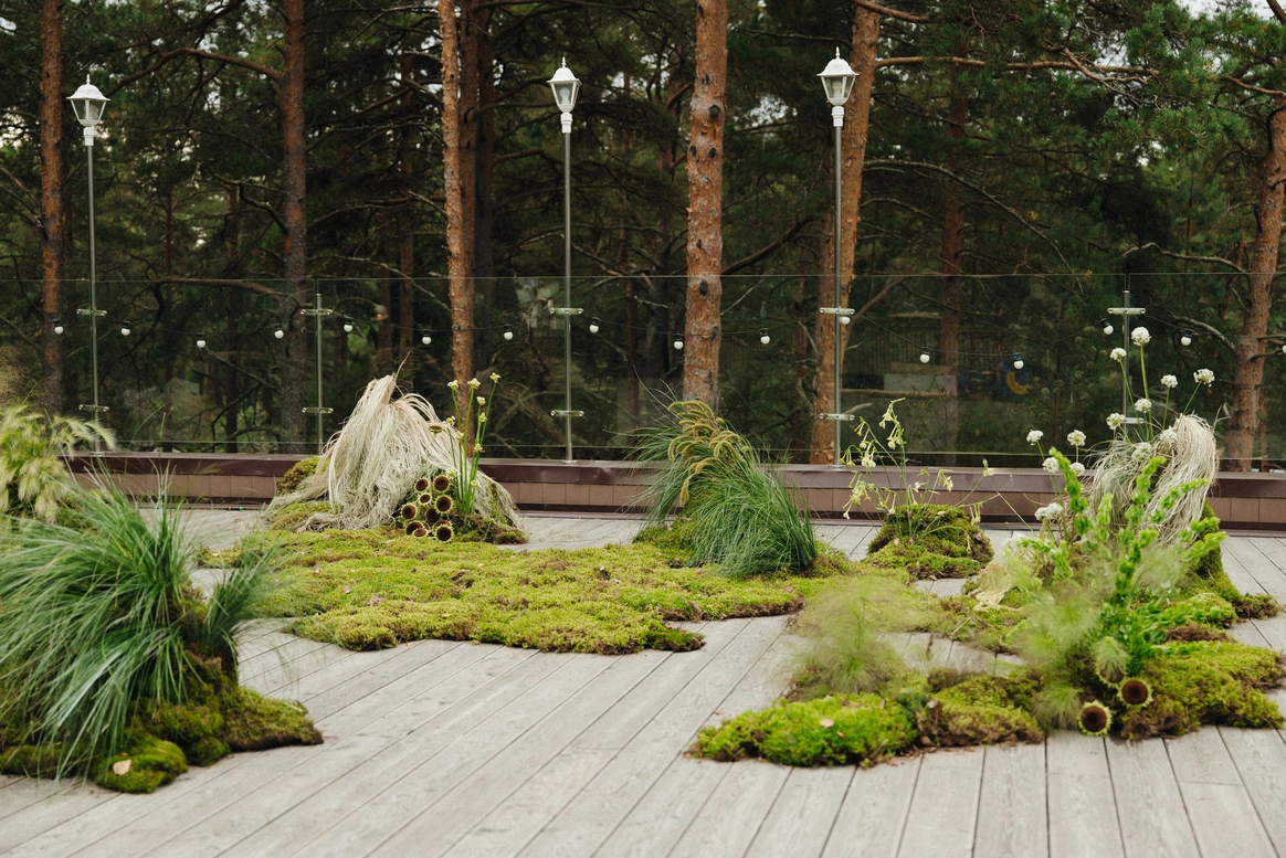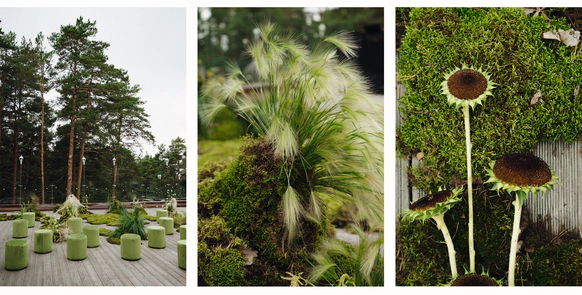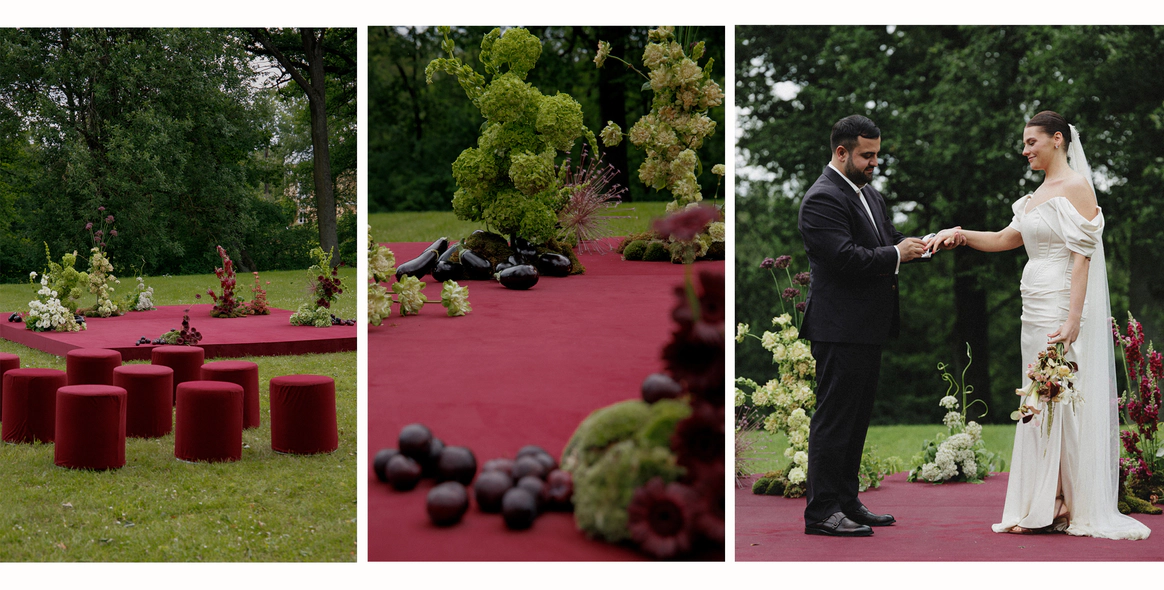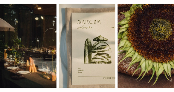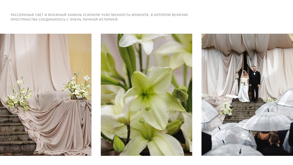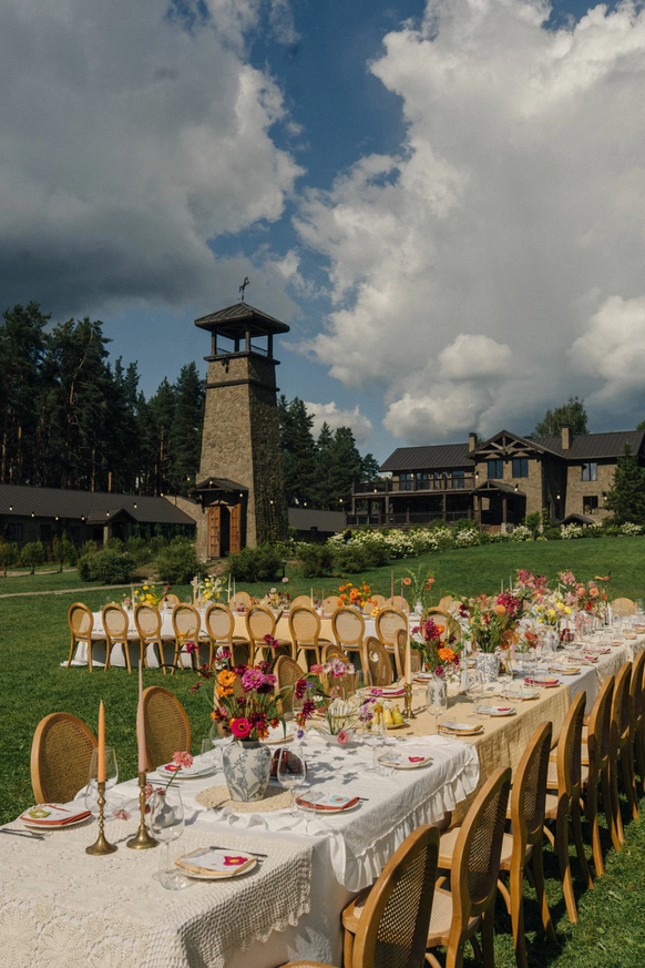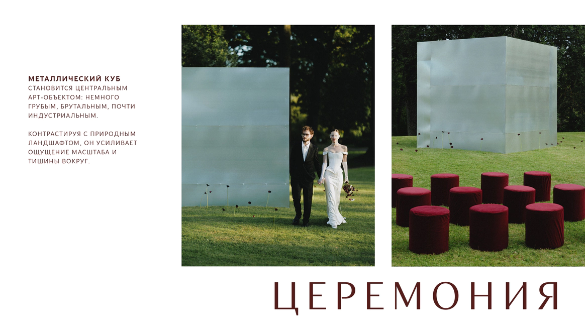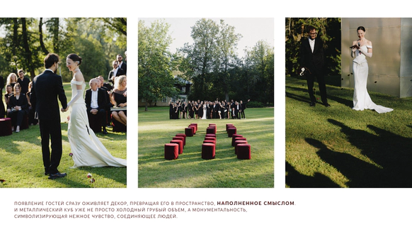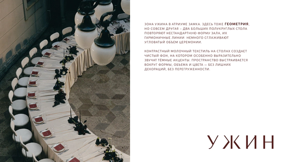 Как итог - выбор строгой геометрии на церемонии и более плавные, мягкие линии в оформлении ужина.
