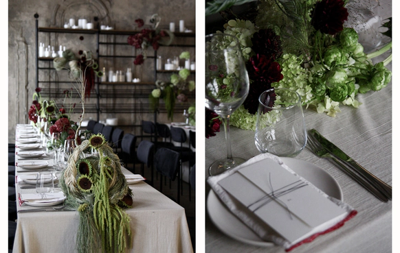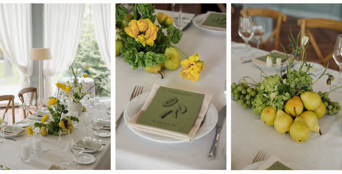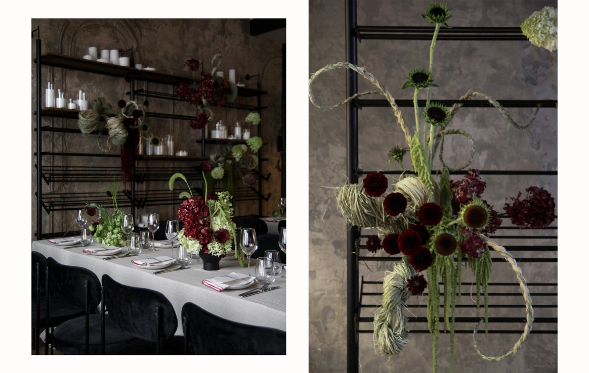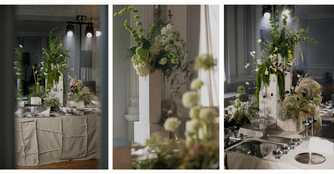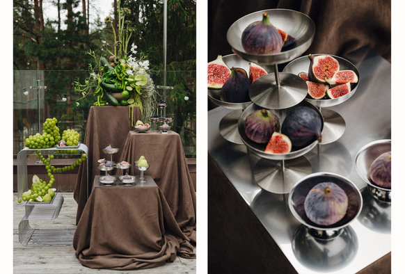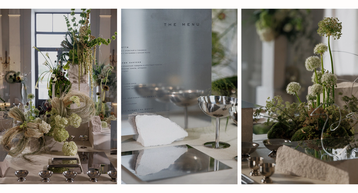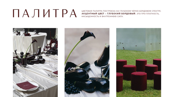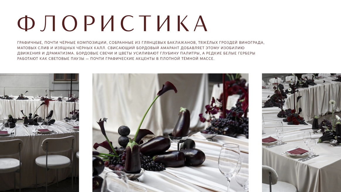 Контрастный молочный текстиль на столах создает чистый фон, на котором особенно выразительно звучат тёмные акценты. Пространство выстраивается вокруг формы, объема и цвета, без лишних декораций, без перегруженности.