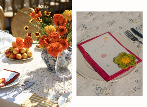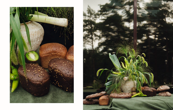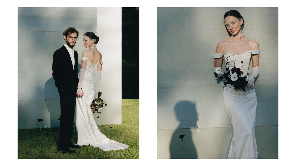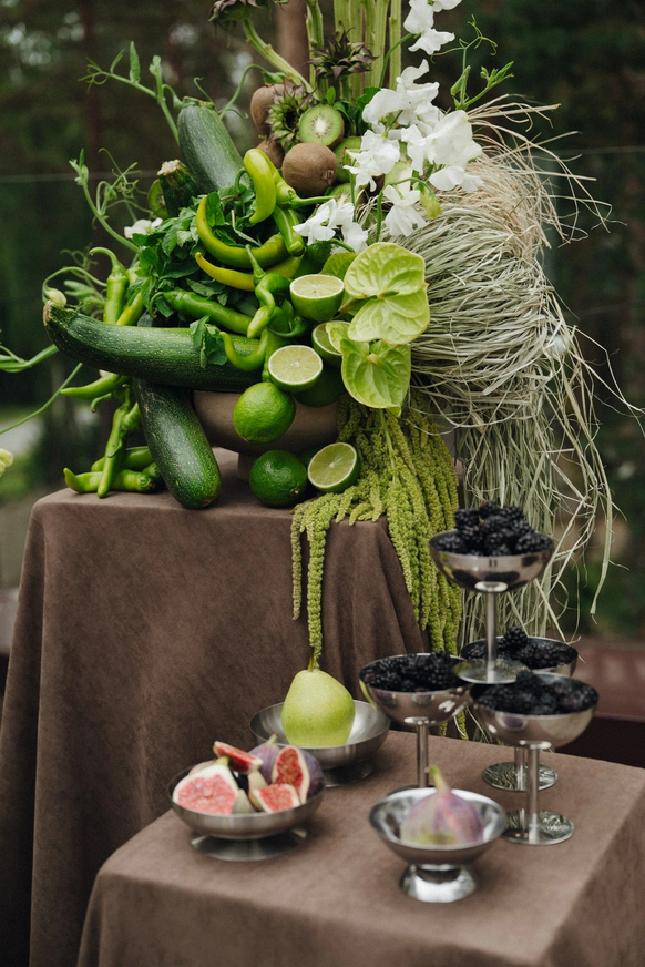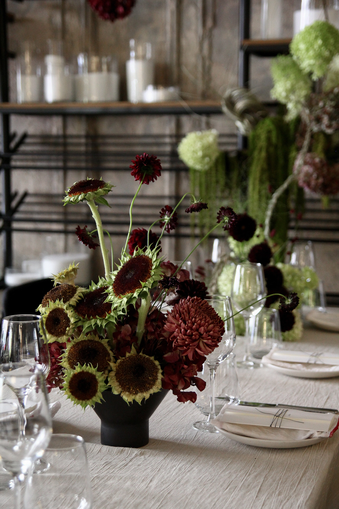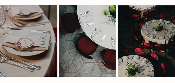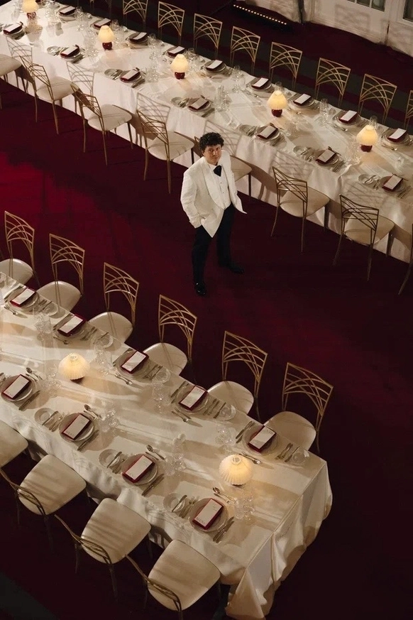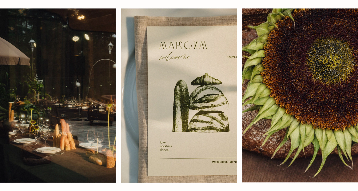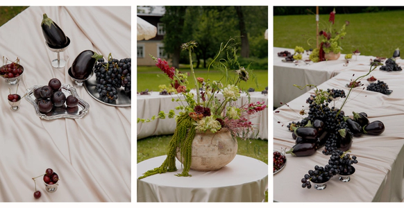 Контрастный молочный текстиль на столах создает чистый фон, на котором особенно выразительно звучат тёмные акценты. Пространство выстраивается вокруг формы, объема и цвета, без лишних декораций, без перегруженности.