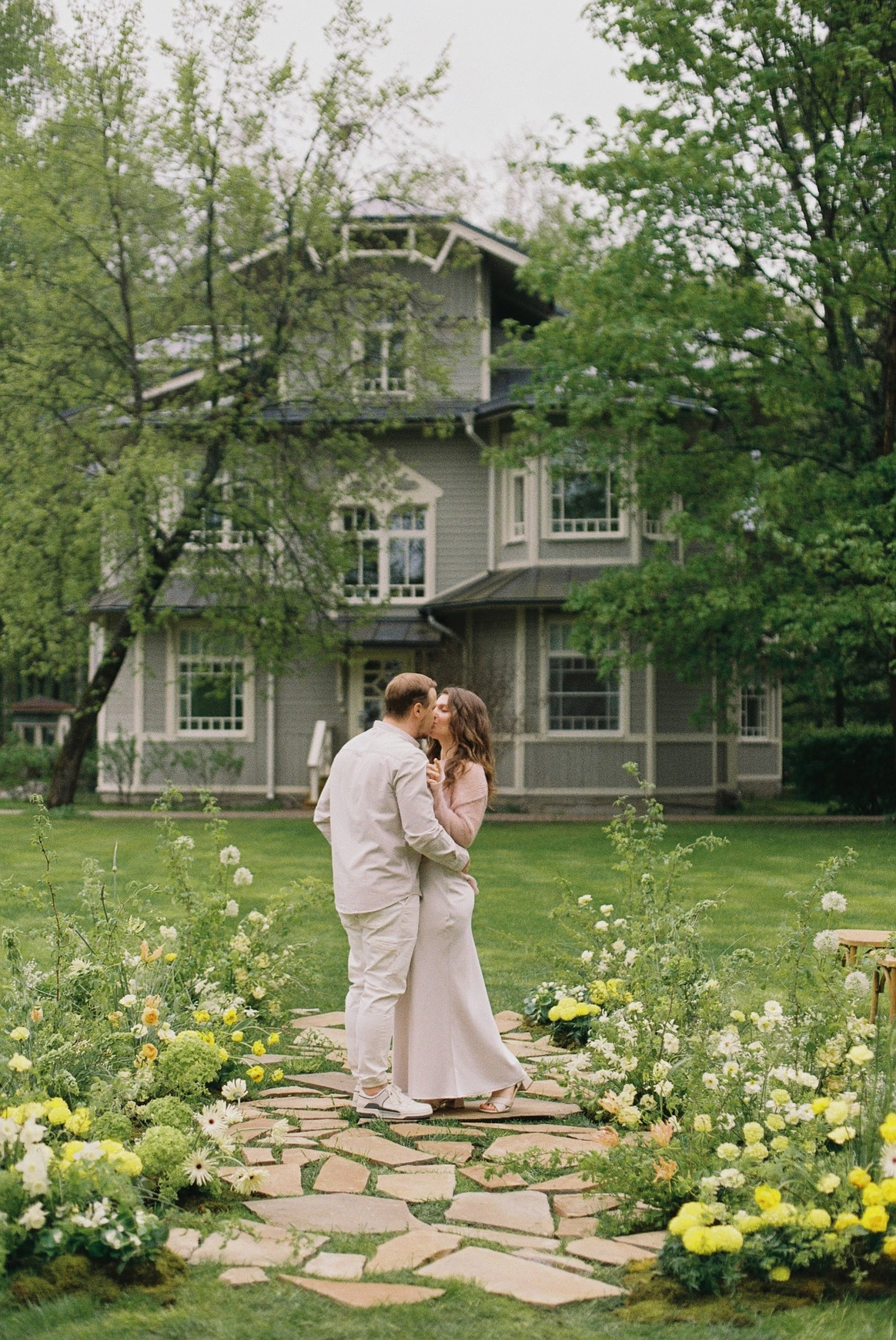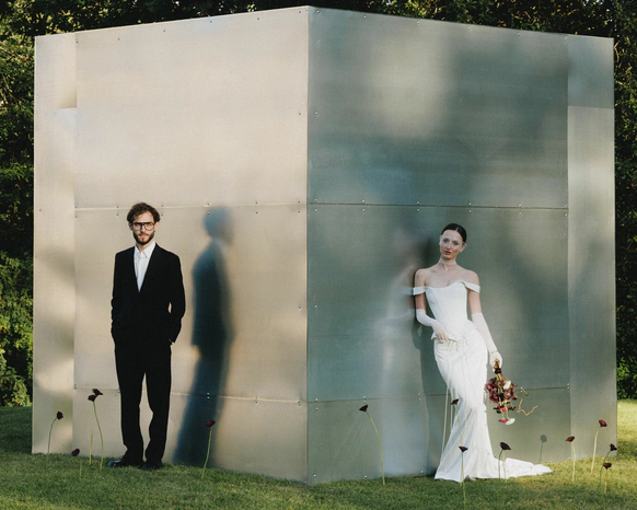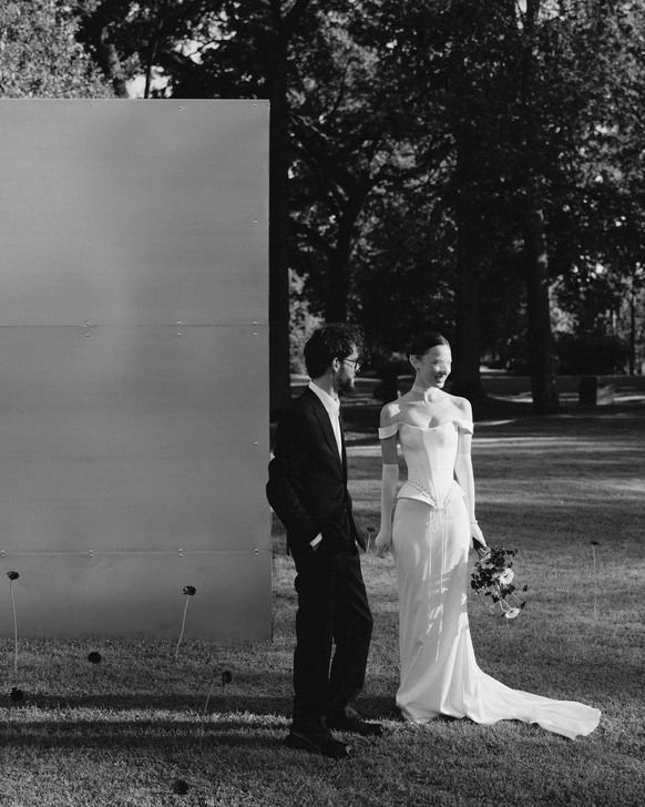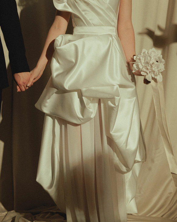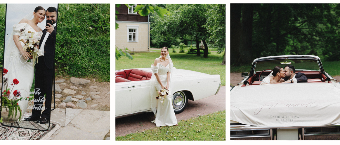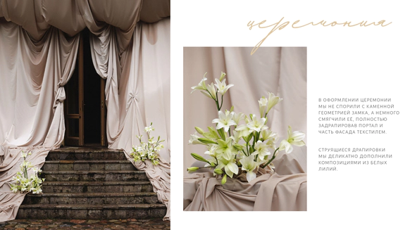 Церемония прошла у фасада замка с выходом во внутренний двор, там, где сама архитектура задает масштаб и торжественность. Ткань струилась по ступеням, собиралась в объемные складки и превращала строгий вход в театральную сцену, готовую раскрыться в момент появления пары.