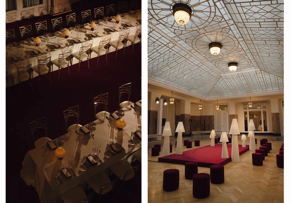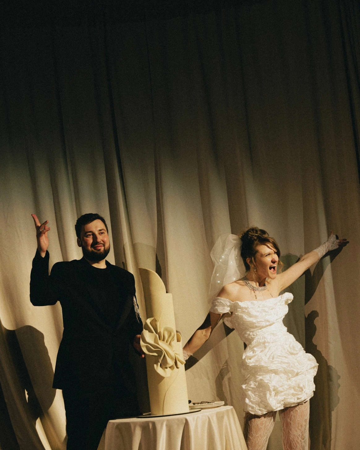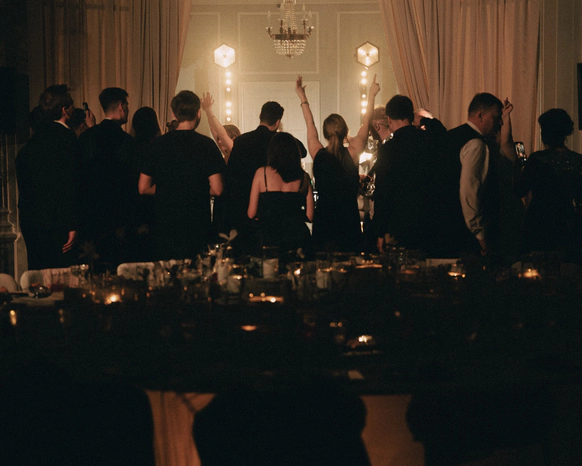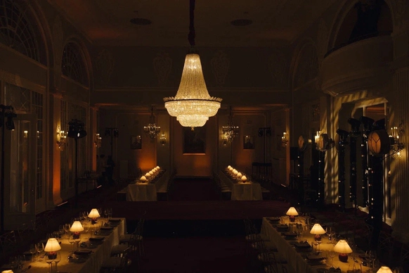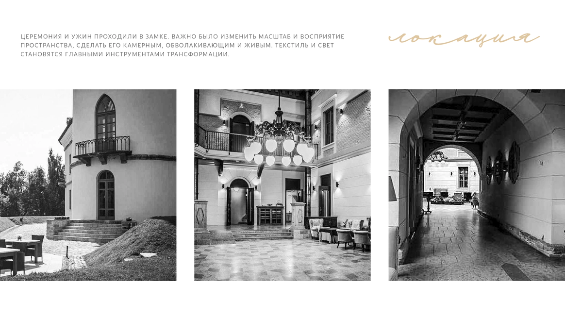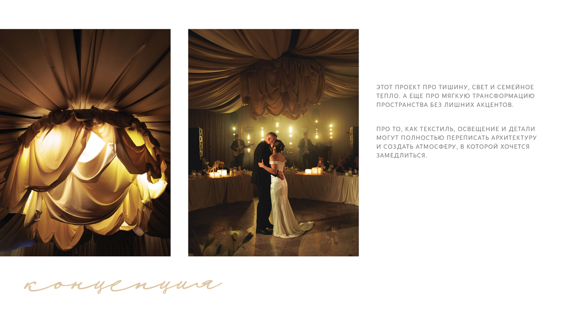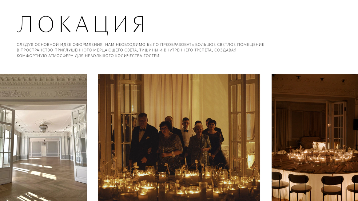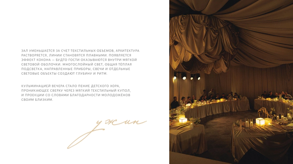 Перед нами стояла задача создать атмосферу камерного свадебного ужина-вечеринки в популярном историческом особняке, трансформируя пространство под авторскую концепцию. Для этого мы полностью затемнили и разделили пространство на три зоны: небольшой зал, отделенный стеклянными перегородками, в котором располагался фуршет; зона ужина в основном зале, намеренно уменьшенном и разделенном на две части масштабным занавесом, за которым скрыта сцена.