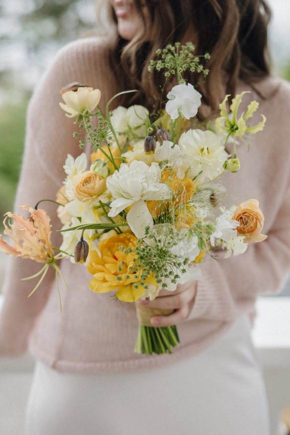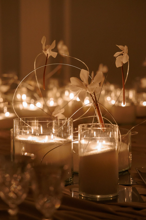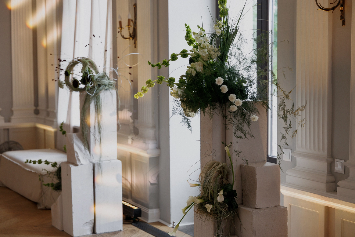 Флористика минималистична и деликатна: светлые цветы поддерживают чистоту палитры, не перегружая пространство. Декор строится на нюансах — фактура ткани, матовость керамики, прозрачность стекла, мягкость света.