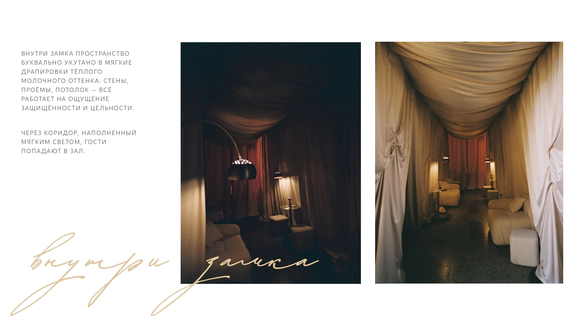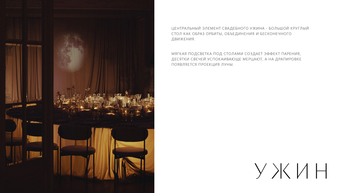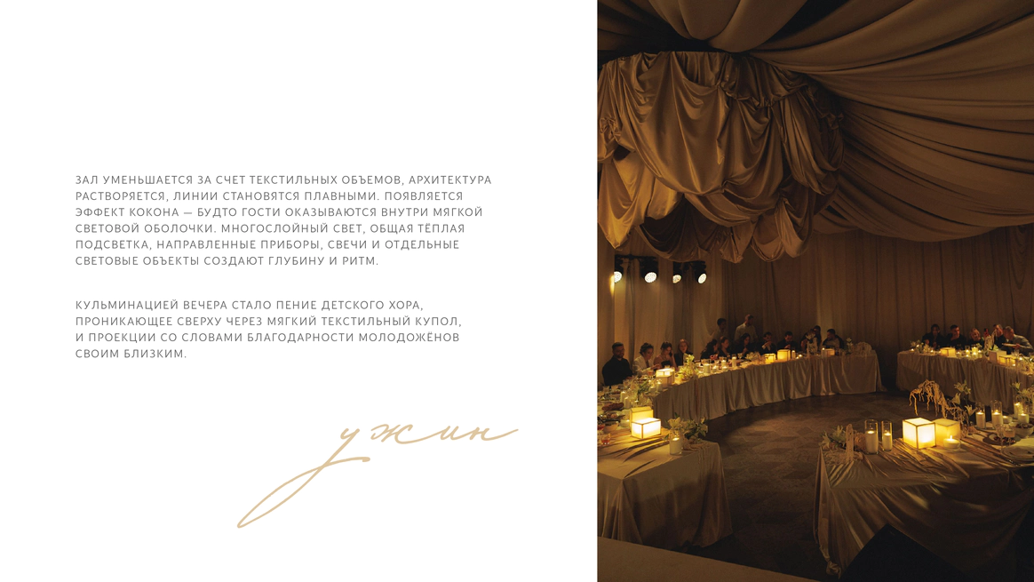 Важно было переосмыслить зал так, чтобы гости буквально «отлетели» от привычной реальности в пространство света, тишины и внутреннего трепета, потеряв счет времени.