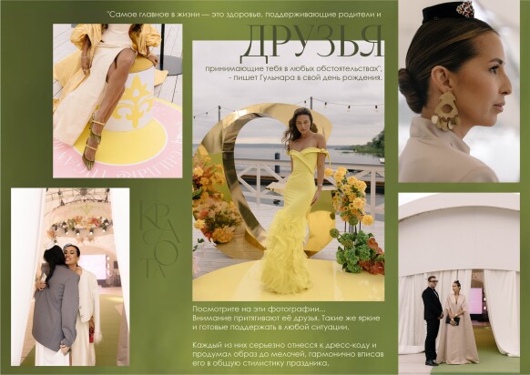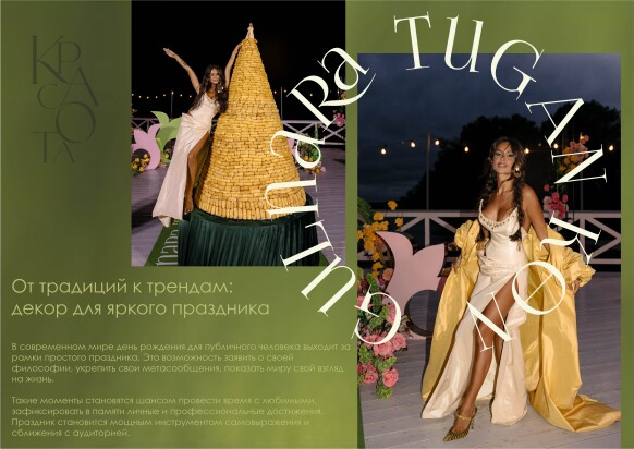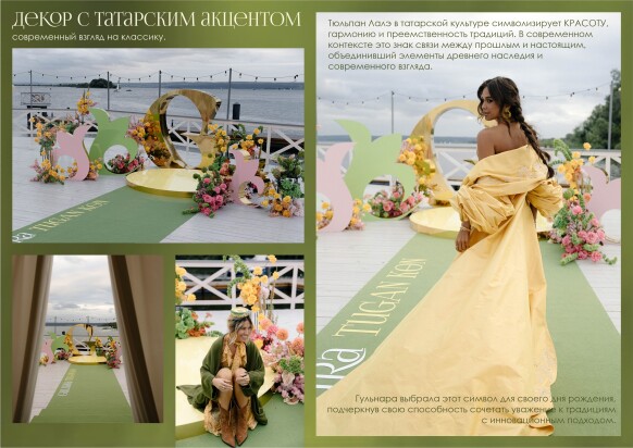 Проект для Гульнары — яркий пример гармоничного сочетания татарских традиций и современности. Вдохновленные символикой тюльпана Лалэ, мы подчеркнули баланс между канонами и инновациями, отражая стремление именинницы сохранять ценности, но не бояться двигаться вперёд.
