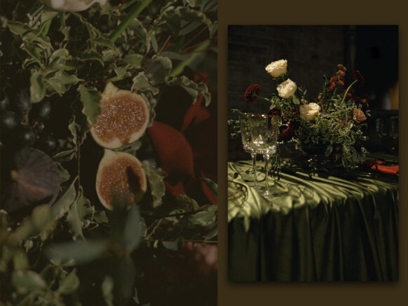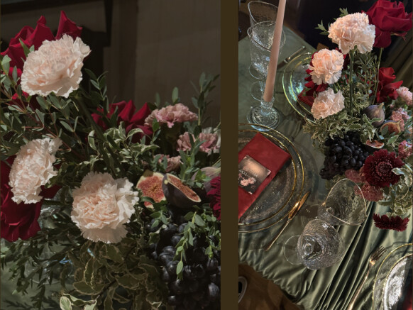 Флористику дополнили гроздями темного винограда и инжира придав композициям аппетитности и элегантности.