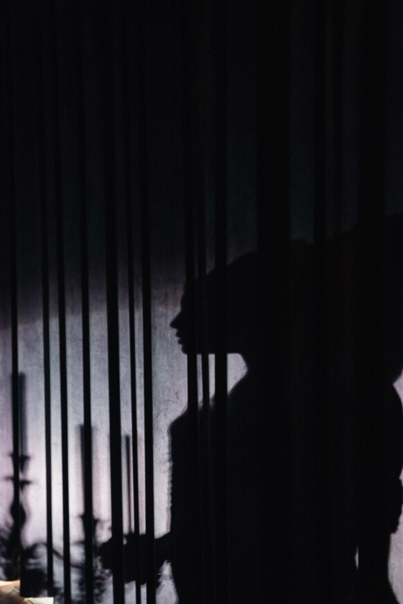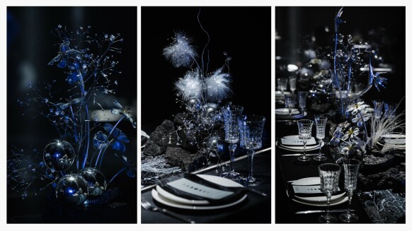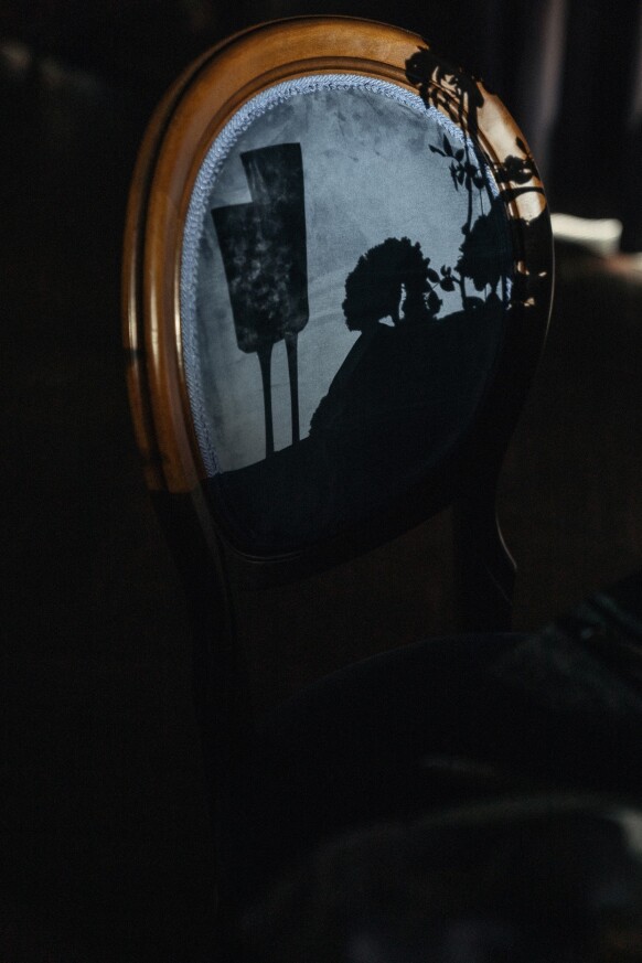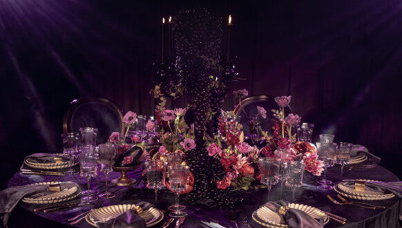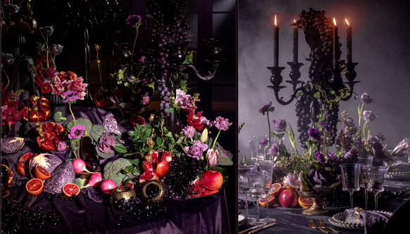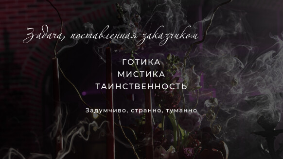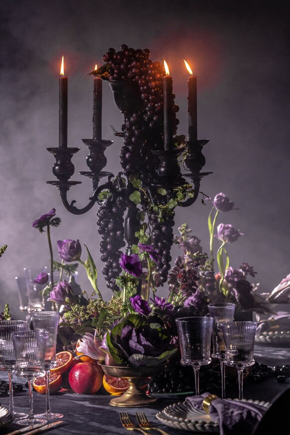 Мистическая, туманная палитра, тяжелый черничный бархат, черные канделябры.