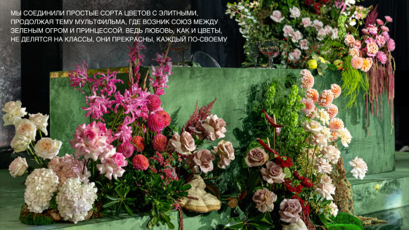 Пара самоиронично представилась нам Шреком и Фионой. Помните сцену, где они женились на болоте? Это вдохновило нас на создание уютной лесной чащи, домика на болоте, с большим количеством флористики, зелени, мха и древесных грибов. Мы решили перенести болото на площадку ресторана и преобразить его.