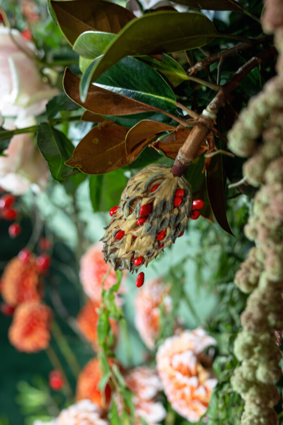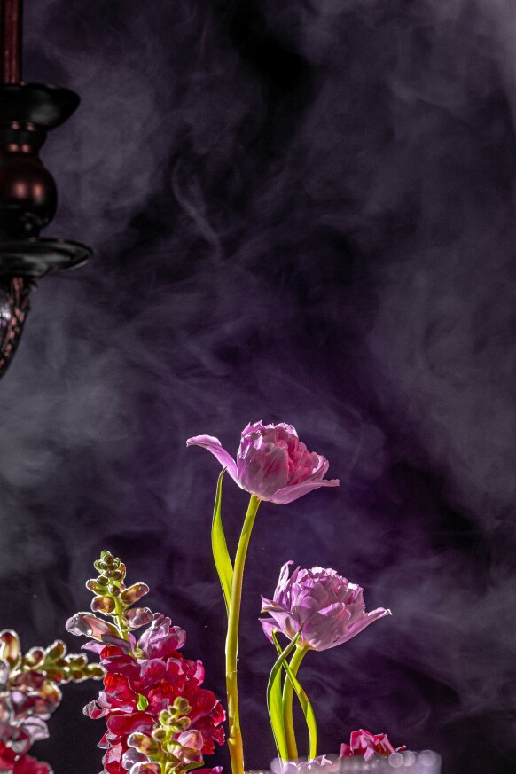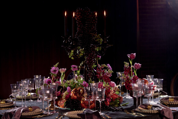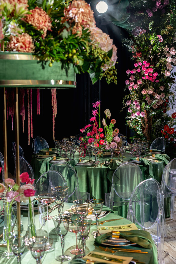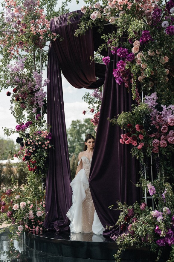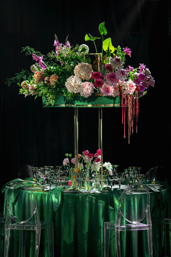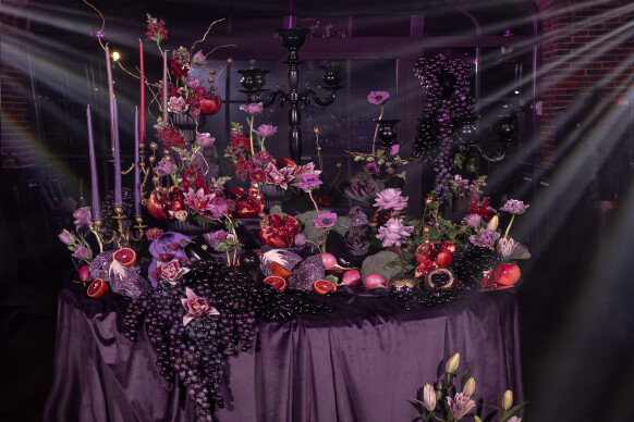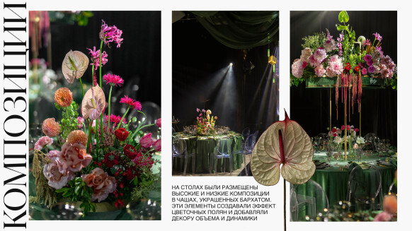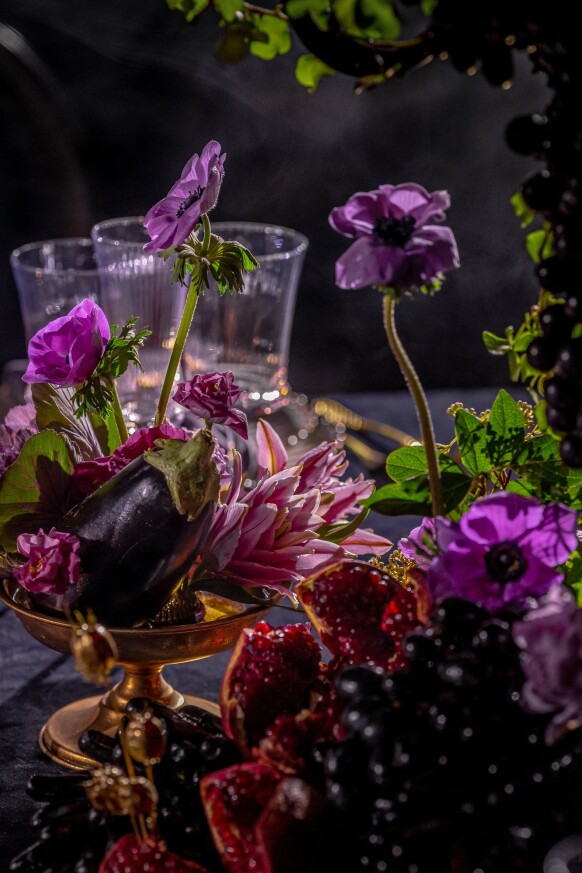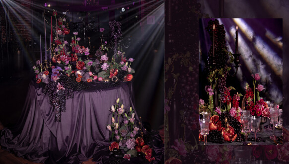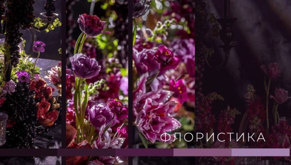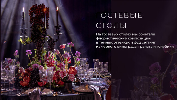 Глубокие оттенки флористики, окутывающая дымка, food-setting в палитре проекта.