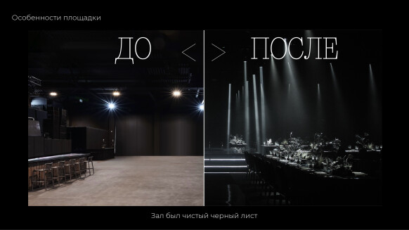 Мы нашли подходящую площадку, но она подлежала сносу. В зале не было кухни, мебели, не было ничего! Черные стены, высокие потолки и полное отсутствие границ. Это была первая и последняя свадьба в этом помещении. После мероприятия зал был снесен.