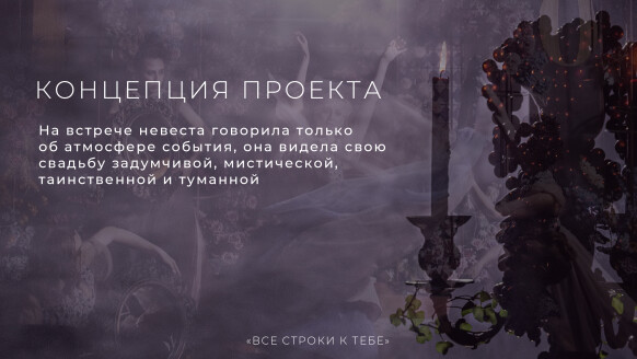 На встрече невеста говорила только об атмосфере события, она видела свою свадьбу задумчивой, мистической, таинственной и туманной.