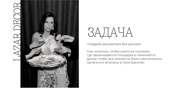 Основная задача состояла в том, чтобы создать свадьбу декоратора без декора в традиционном смысле. Концепция требовала минимализма, оригинальности и полного слияния пространства с идеей.