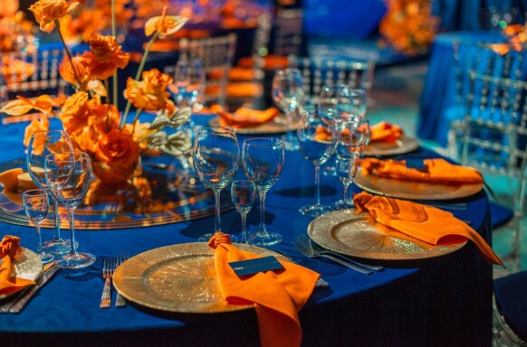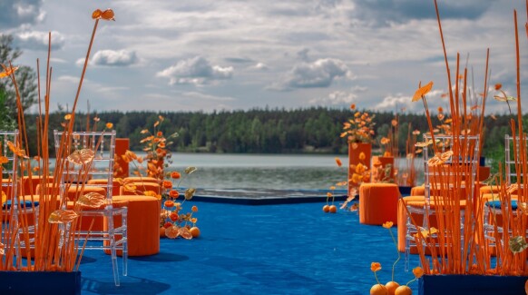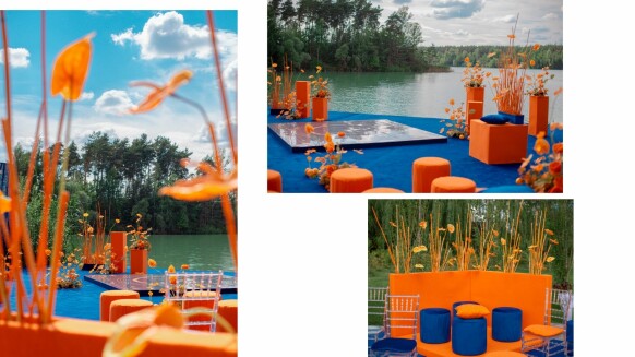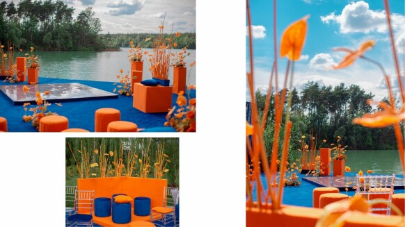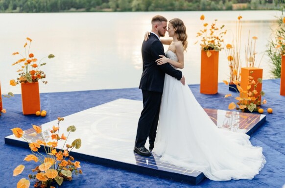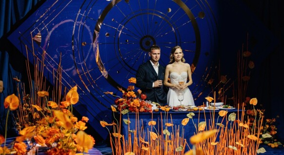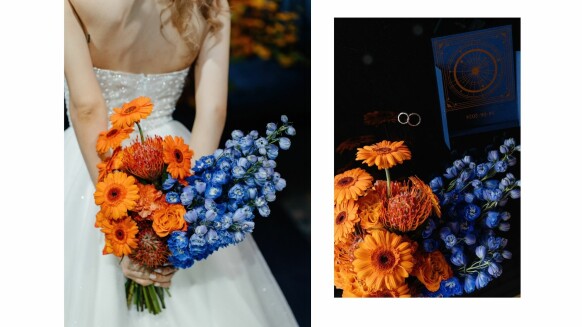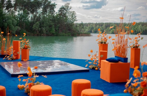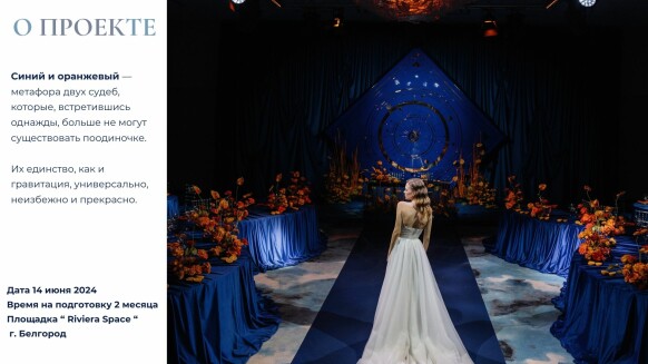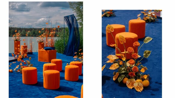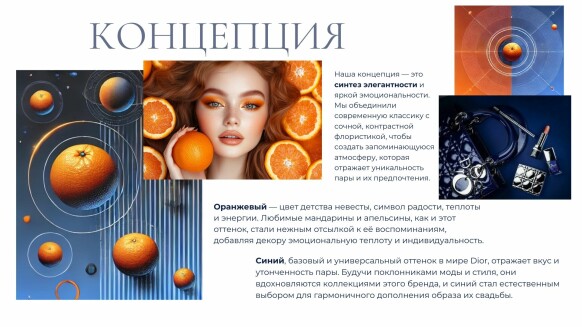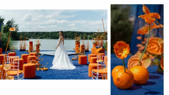 Любимый цвет невесты – оранжевый, любимые фрукты – мандарины и апельсины. Будучи поклонниками моды и стиля Dior, пара активно следит за их трендами, и синий стал естественным выбором для гармоничного дополнения образа их свадьбы.