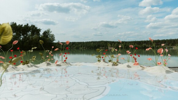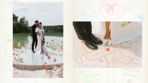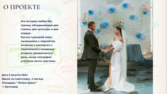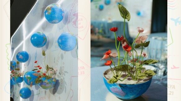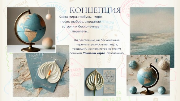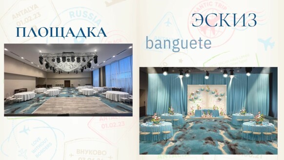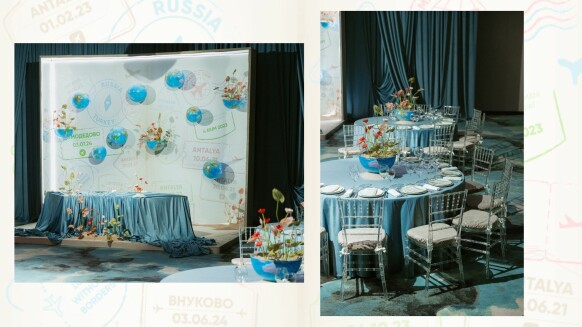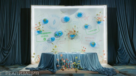 Фон президиума, символизировал их совместный путь: реальные отпечатки штампов из паспортом пары, даты перелетов, географические метки — все это стало картой их любви. Маршрут, по которому шаг за шагом строились их отношения. Глобусы, ставшие частью декора, олицетворяют не просто путешествия, а целый мир, который пара создала вместе. Они парят в воздухе, словно лёгкие воспоминания о дорогах, которые привели их друг к другу.