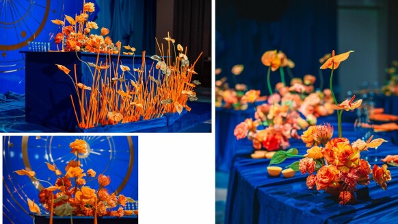Эта деталь была выбрана для усиления динамики и символики притяжения, отражая тему гармонии и равновесия. Оранжевый цвет стал основным во флористике, и для усиления этого цвета мы решили добавить выкрашенные ветки камыша, добавив текстуры и динамики декору.