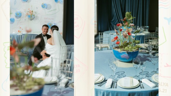 Зона церемония напоминала о романтических встречах у моря: песок, нежные цветы, словно выросшие на берегу. Пара стояла на поверхности земного шара, где была отмечена та самая точка на карте Турция.