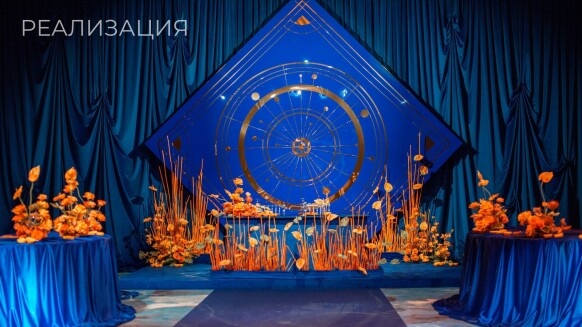 В реализации проекта синий цвет стал основным. Полностью закрывая заднюю стену президиума, он создавал глубокий, выразительный фон, на котором главной доминантой стал гравитационный круг, помещённый в ромб. Круг состоял из определенного количества окружностей и был разработан по индивидуальному проекту, в основе которого были личные данные пары: даты рождения, знакомства, начала отношений и так далее.
