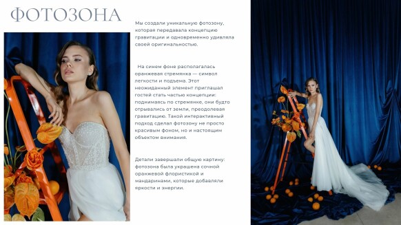 Идея родилась после общения с парой, мы решили объединить два противоположных цвета как и их притяжение друг к другу, отсюда появилась «Гравитация» – сила, которая существует в масштабах Вселенной и проявляется в бесконечном количестве форм. Она не только удерживает планеты на своих орбитах, но и соединяет сердца, объединяя людей в нечто большее.