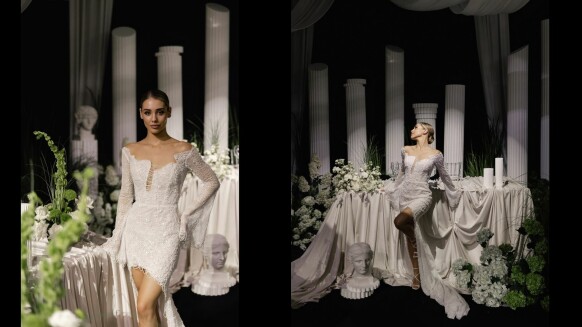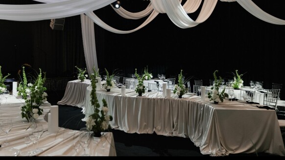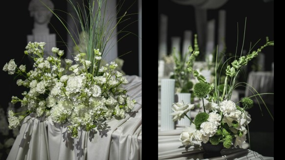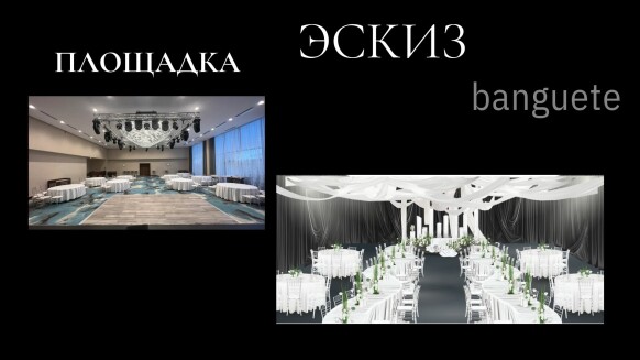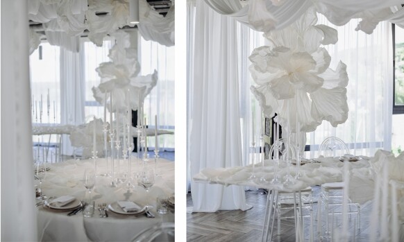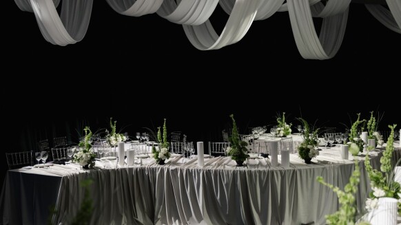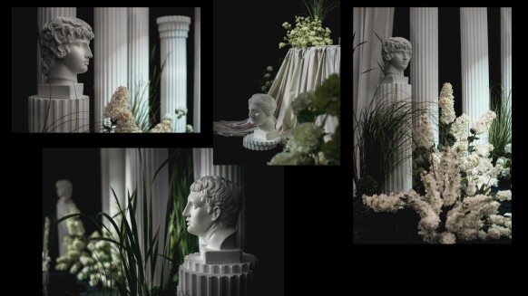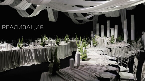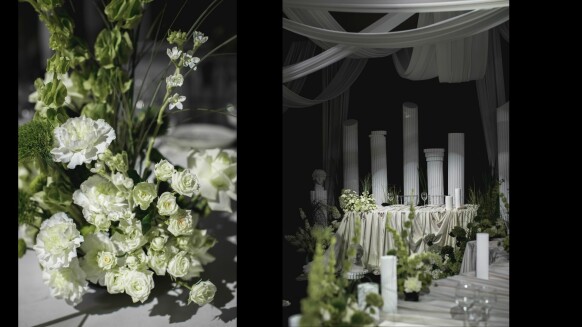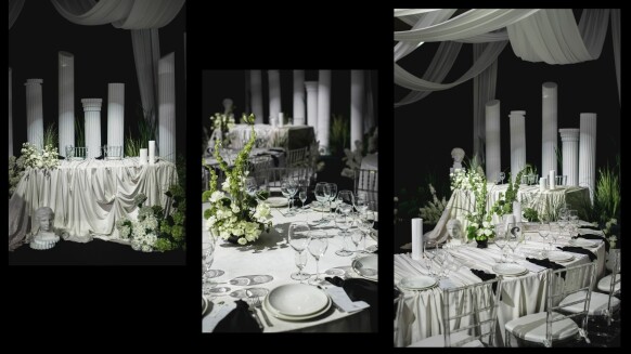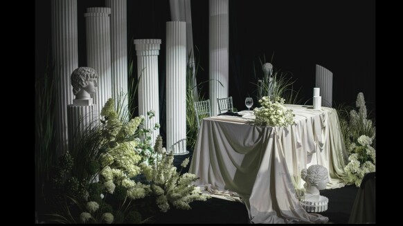 В этом проекте мы полностью изменили площадку, обшили все стены струящимися тканями, создавая ощущение уединенного мира, оторванного от реальности. Потолок окутан воздушными полотнами, словно облака, парящие в храме любви, что добавляет пространству глубины и легкости. Пол перекрыли в насыщенный черный цвет, создав эффект безграничности, подчеркивая благородную белизну античных элементов.
