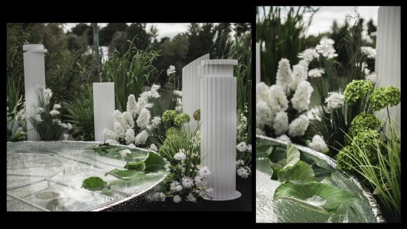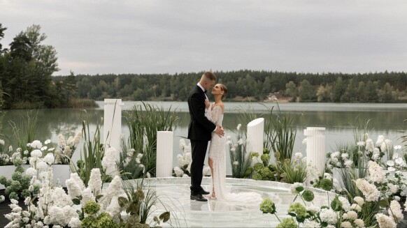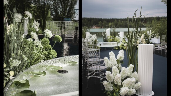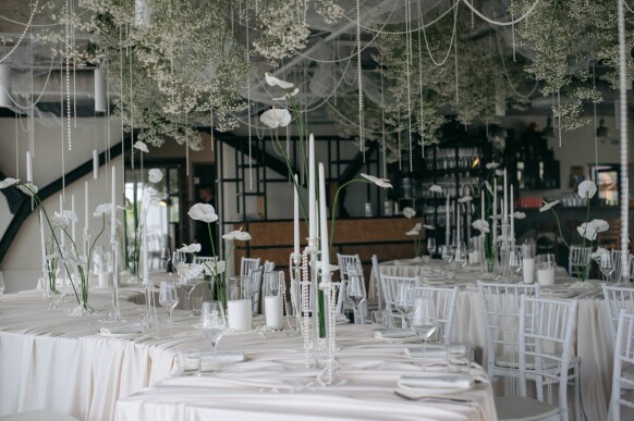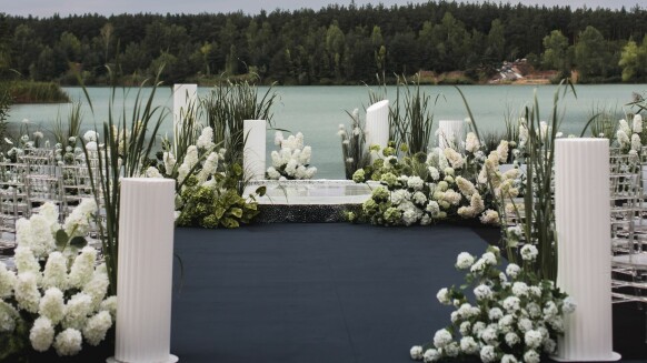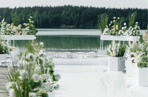 Для зоны церемонии мы создали поистине неземную сцену, словно перенесенную из мифов Древней Греции. В центре этого пространства появился символичный бассейн – отражение чистоты, глубины чувств и вечности любви. Посреди водной глади мы установили прозрачный подиум, создавая эффект парения пары над водой – легкость, невесомость и ощущение, будто они стоят на облаках Олимпа. Бассейн оживили листья кувшинок и прекрасные рыбки. Вокруг подиума величественно возвышались античные колонны – символы прочности и нерушимости союза. Они словно охраняли этот священный момент, превращая место церемонии в настоящий храм любви. Пространство дополнили пышные композиции из белоснежных цветов, нежной зелени и воздушных трав, которые добавляли естественности и живой динамики.