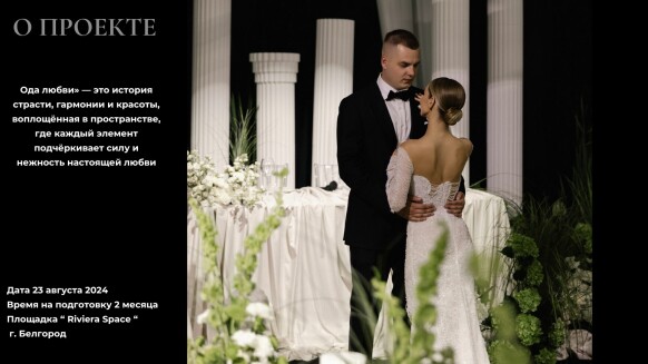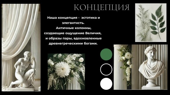 Идея этого проекта родилась из образа самой любви – возвышенной, вечной и божественной. Мы вдохновились древнегреческой мифологией, где чувства воспевались как высшая сила, а любовь была даром богов. Главный образ – невеста, воплощающая в себе саму Афродиту, богиню любви и красоты. Ее грация, легкость и сияние наполняют пространство особой магией. Жених, словно смертный, которому выпала честь взирать на богиню, смотрит на нее с трепетом, восхищением и безграничной любовью.