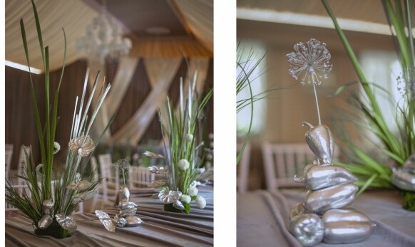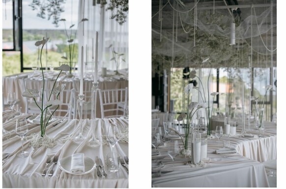 Гостевые столы также дополнили глобусы, наполненном белоснежным песком, в которых расцветает флористика, передающая дух свободы и бесконечности.