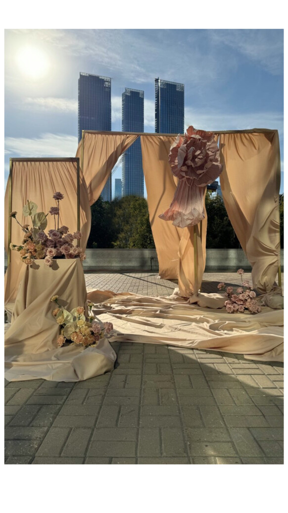 Главным вызовом стал ветер: порывы до 8 м/с превратили легкое колыхание тканей в испытание на прочность. Переносить церемонию внутрь не хотелось, поэтому мы немного углубили зону выездной, где ветер был немного слабее, пригрузили конструкции 300 кг и спрятали это красивенько :)