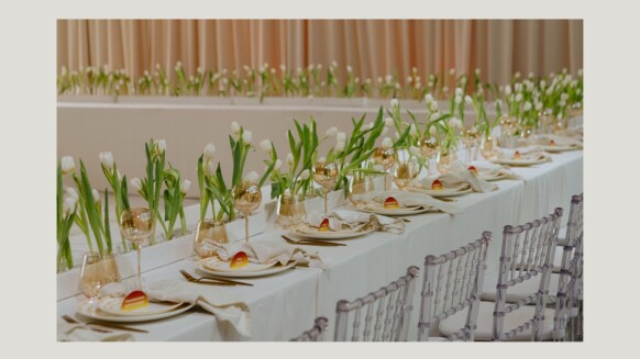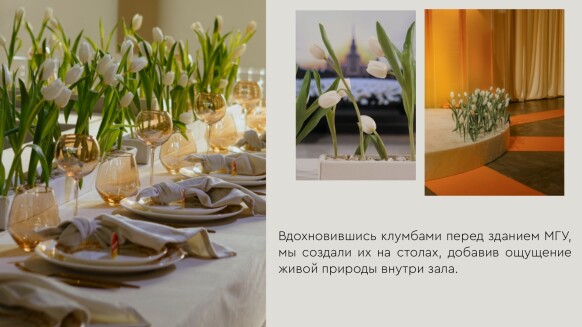 П-образная рассадка напоминает аудиторию МГУ, место знакомства пары. Клумбы с белыми тюльпанами, вдохновленные клумбами перед университетом, создают эффект сада. Бежево-золотистая сервировка перекликается с утренним светом.
