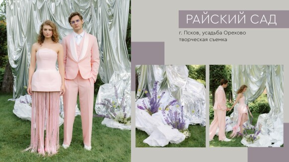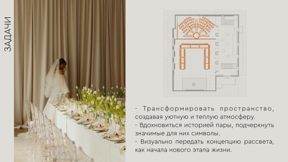 Свадьба, символизирующая первую весеннюю зарю – начало нового дня и новой семьи. В основе концепции история пары: знакомство в МГУ, любимая песня – «На заре» Басты, место силы – дача жениха. Атмосфера свадьбы – камерная, теплая, наполненная личными символами.