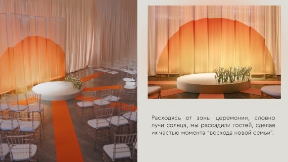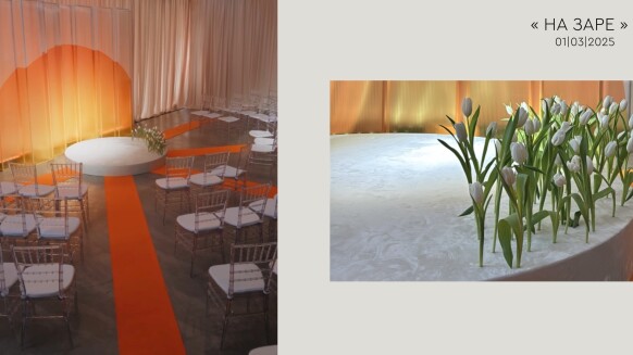 Церемония оформлена поликарбонатной конструкцией в виде восходящего солнца, отражающей легкость первых лучей. Подиум с белыми тюльпанами – символ новой жизни. Гости рассажены лучами, становясь частью рассвета, освещающими путь молодоженов в новую жизнь.