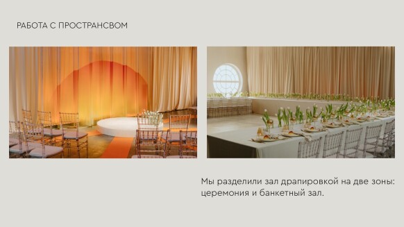 Эта свадьба – не просто красивое оформление, а символичная история двух людей, отраженная в деталях. Солнце, поднимающееся на церемонии, – это новый день, новая семья, новый этап их жизни. А белые тюльпаны – нежность, чистота и любовь, которые распускаются с первыми лучами солнца.