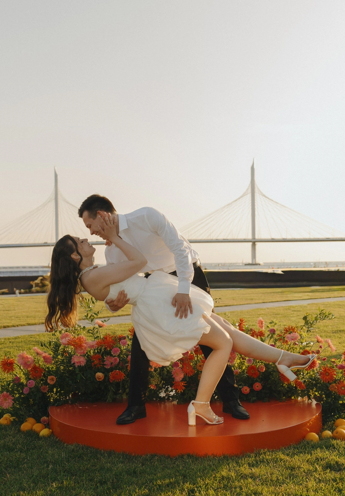 Главный запрос звучал так: «Хочется цвета. Должно быть ярко, весело, интересно и не напряжно». Итог: городская локация с парком, вытянутый зал с единым столом, двойная арка на церемонии, собственноручно сшитые невестой цветы на стол, идеальный сабраж, битва на мечах на сборах и миллион мыльных пузырей в финале вместо бенгальских огней.