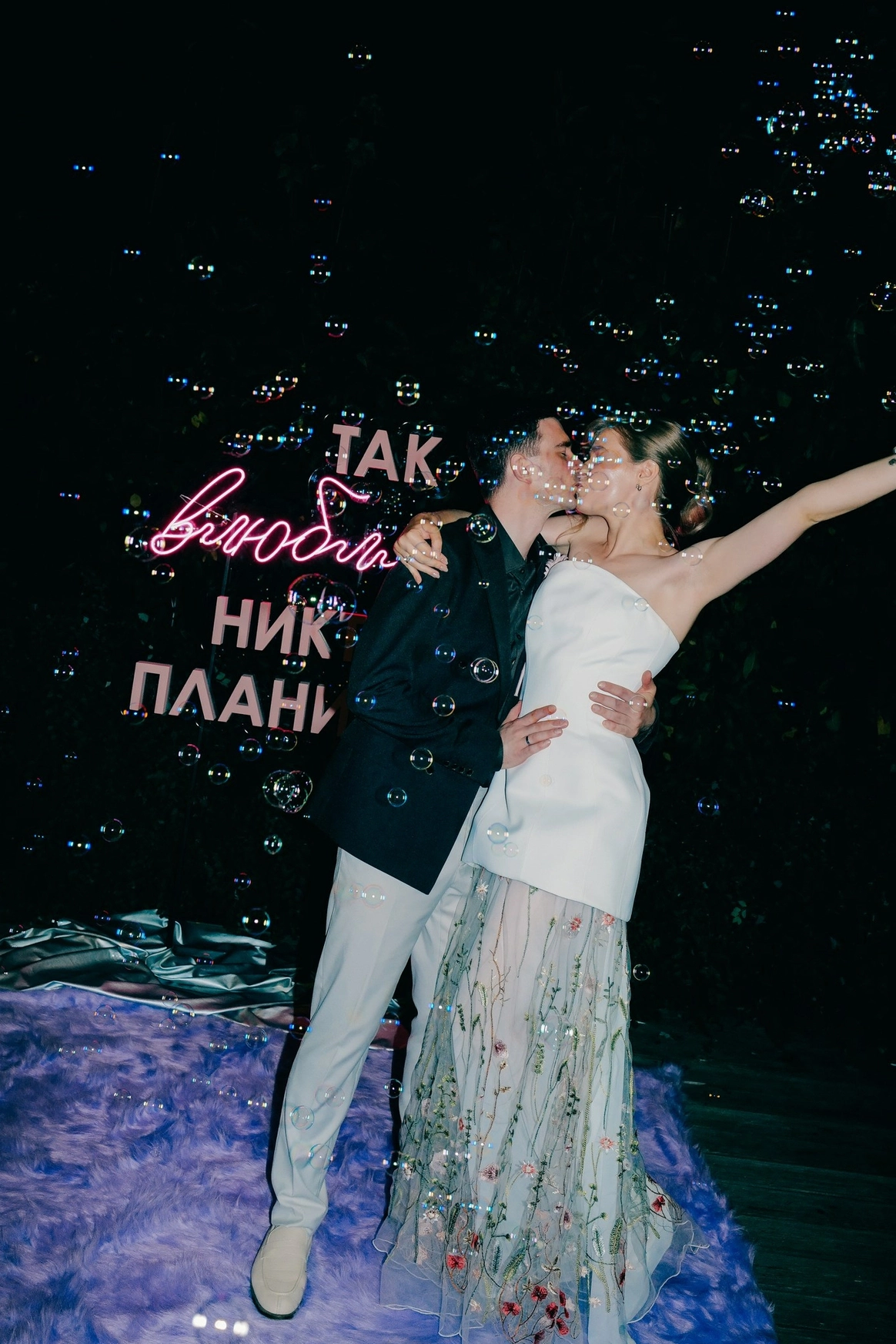 Мы сделали её инженерной загадкой: на церемонии две арки. Первая - штора с бусами, вторая - неоновая вывеска с той самой фразой. В нужный момент штора падает, открывая надпись - символ того, как их непланируемая встреча стала главным событием. Неон в последствие стал семейной реликвией.